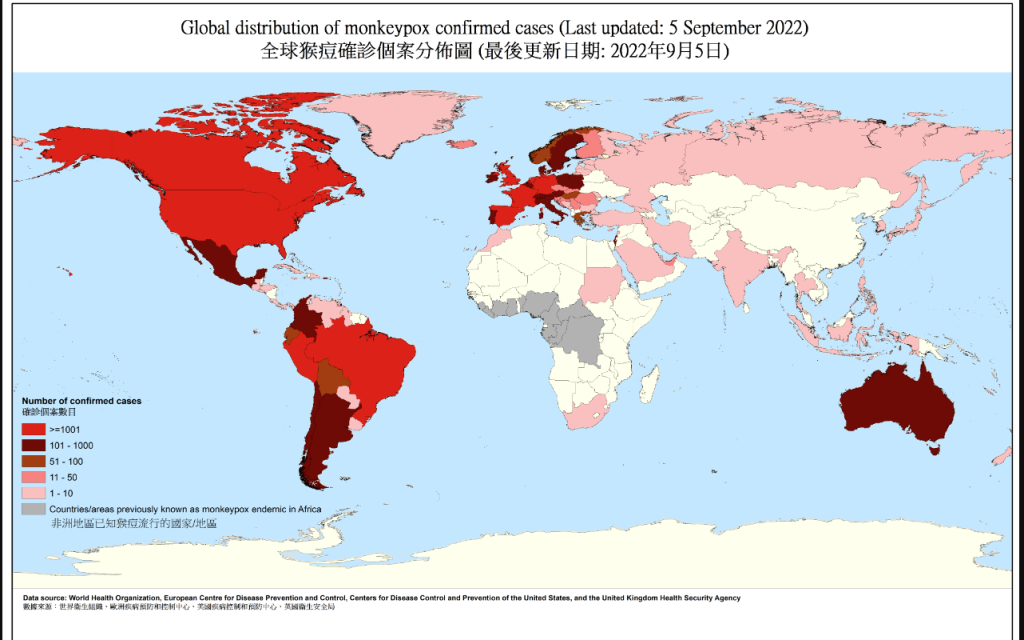 據世衞公布,猴痘最先於英國出現。根據衞生防護中心資料,自今年1月1日至9月1日,世衞收到102個國家/地區呈報51163宗實驗室確診猴痘病例,其中包括17宗死亡個案。全球最多猴痘個案的10個國家/地區包括有美國 (18303)、西班牙 (6543) 、巴西 (4876) 、法國 (3558)、德國 (3480)、英國 (3413) 、秘魯 (1496)、加拿大 (1228)、荷蘭 (1166)和葡萄牙 (846)。這些國家的病例佔全球報告病例的87.8%。