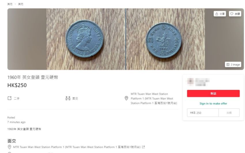【橙訊】英女王伊利沙伯二世逝世,終年96歲,她在位70年間,曾經兩度到訪香港,引發不少港人集體回憶,更有人在英女王死訊公布後,在網上拍賣平台出售「女王頭」香港硬幣。其中一枚1960年發行的1元硬幣,標價250元,即升值約249倍。另有賣家發售1963年發行的5毫硬幣,標價50元,即升值約49倍。