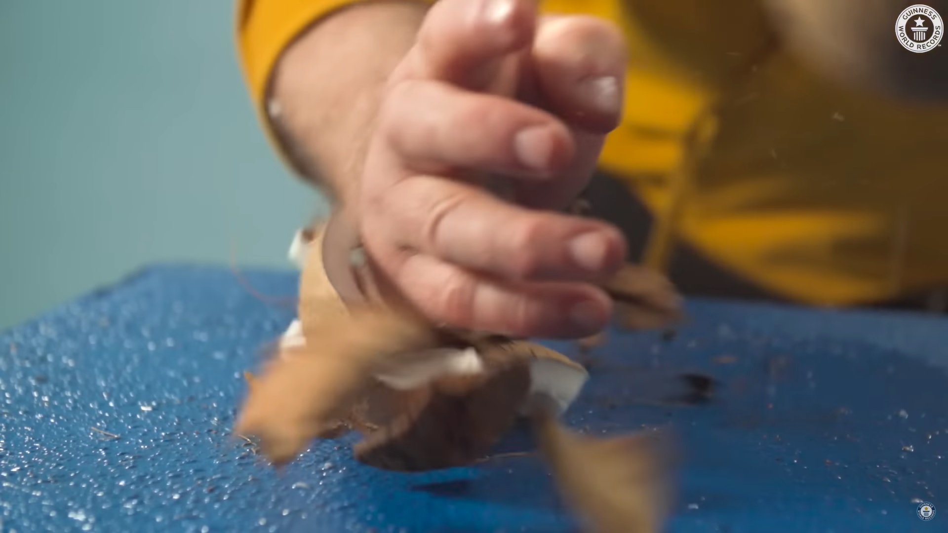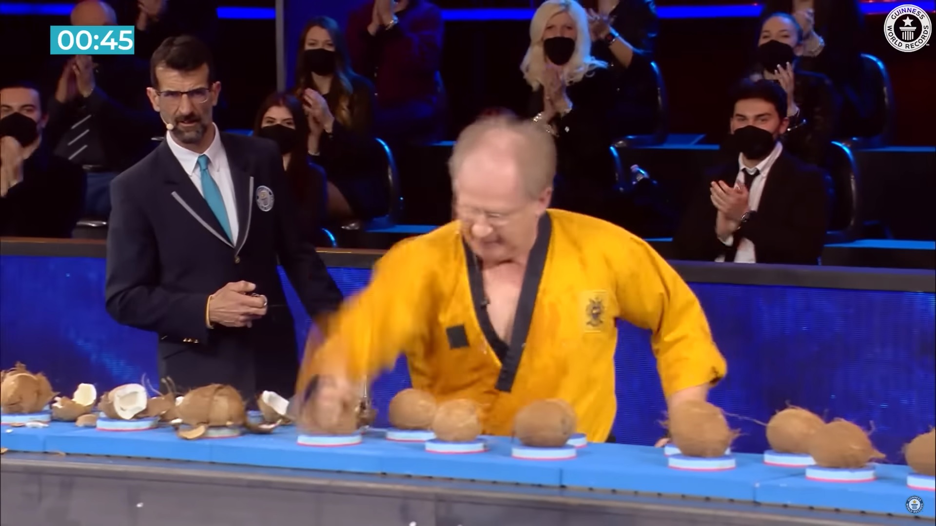 Kahrimanovic用手錘輕鬆擊爆椰子。(圖:Guinness World Records@YouTube)