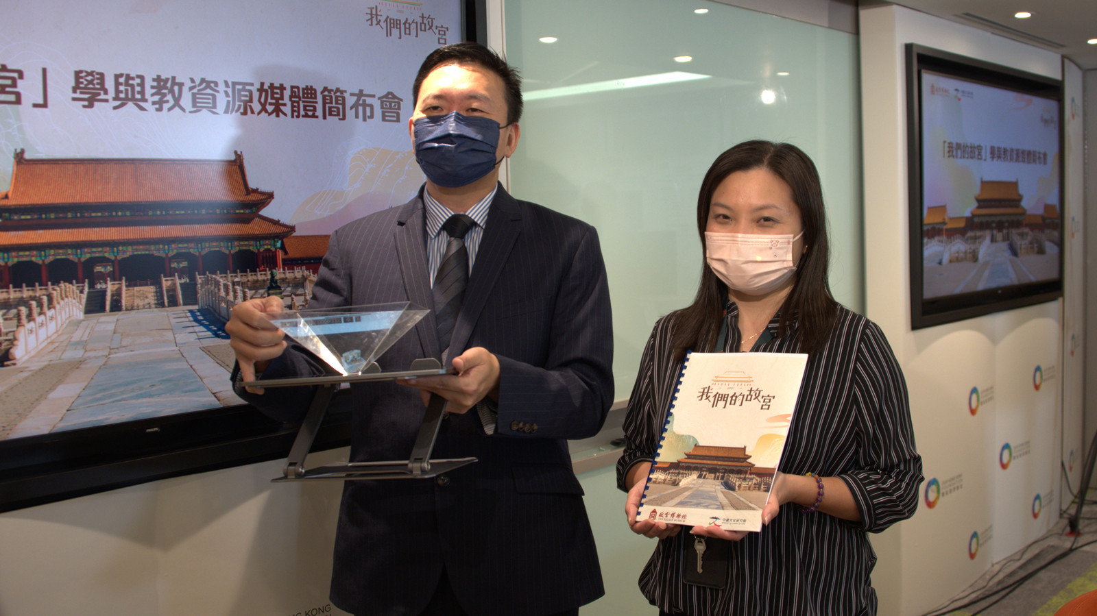 中國文化研究院院長邱逸(左)向傳媒介紹「我們的故宮」學與教資源項目。圖:橙新聞