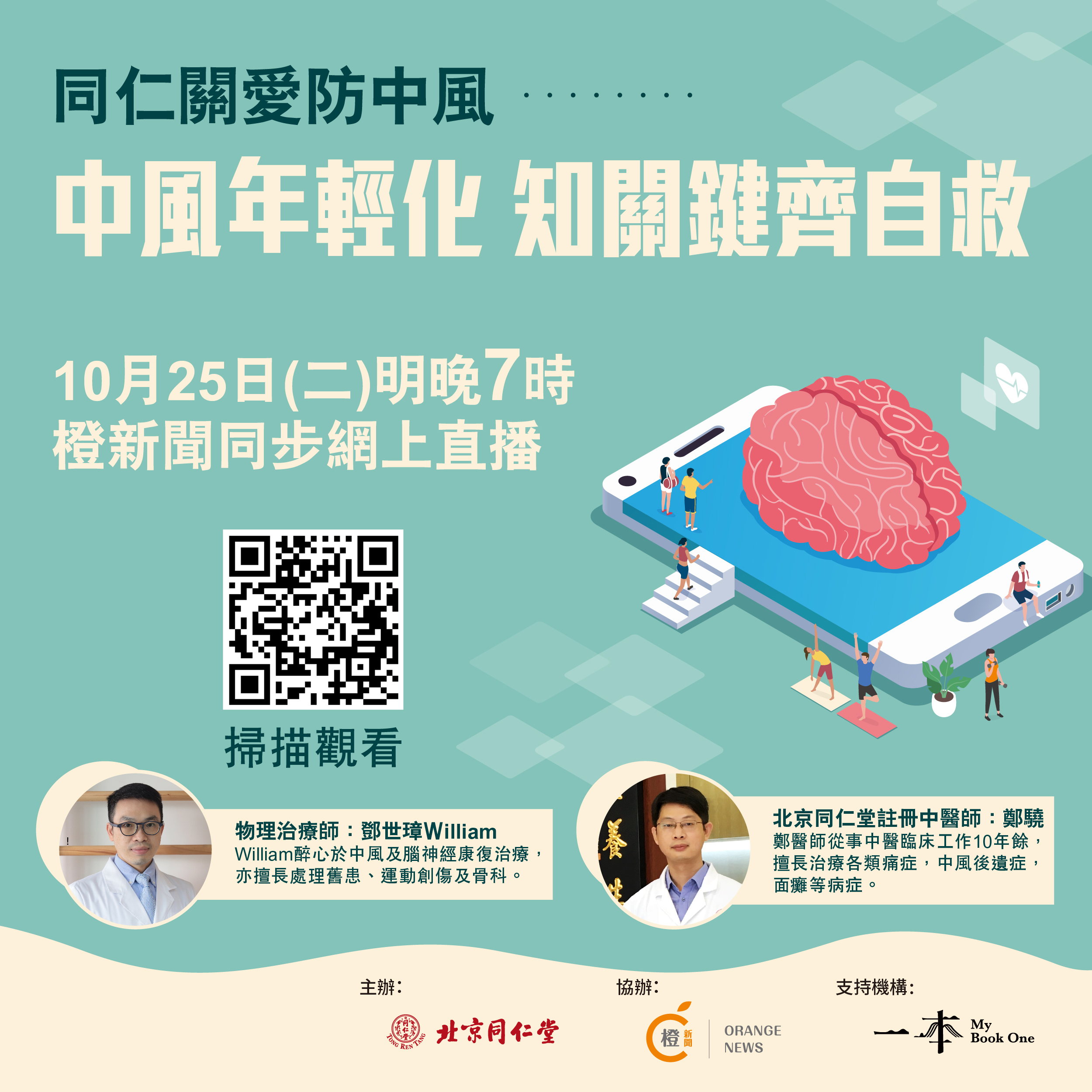 北京同仁堂積極向各界傳遞關注預防中風的健康訊息。為提升大眾對中風年輕化的議題的積極關注,北京同仁堂第七屆「同仁關愛防中風」舉辦 「同仁關愛防中風線上直播講座」,活動誠邀北京同仁堂註冊中醫師鄭驍和物理治療師鄧世璋William,從飲食及運動著手,將於講座中與大家分享中風種類及成因,同時亦會為大家介紹穴位按摩知識、食療養生建議以及辦公室防中風的運動,分享防中風小貼士,讓大家了解中風資訊之餘,也能掌握在辦公室的舒鬆運動預防中風。