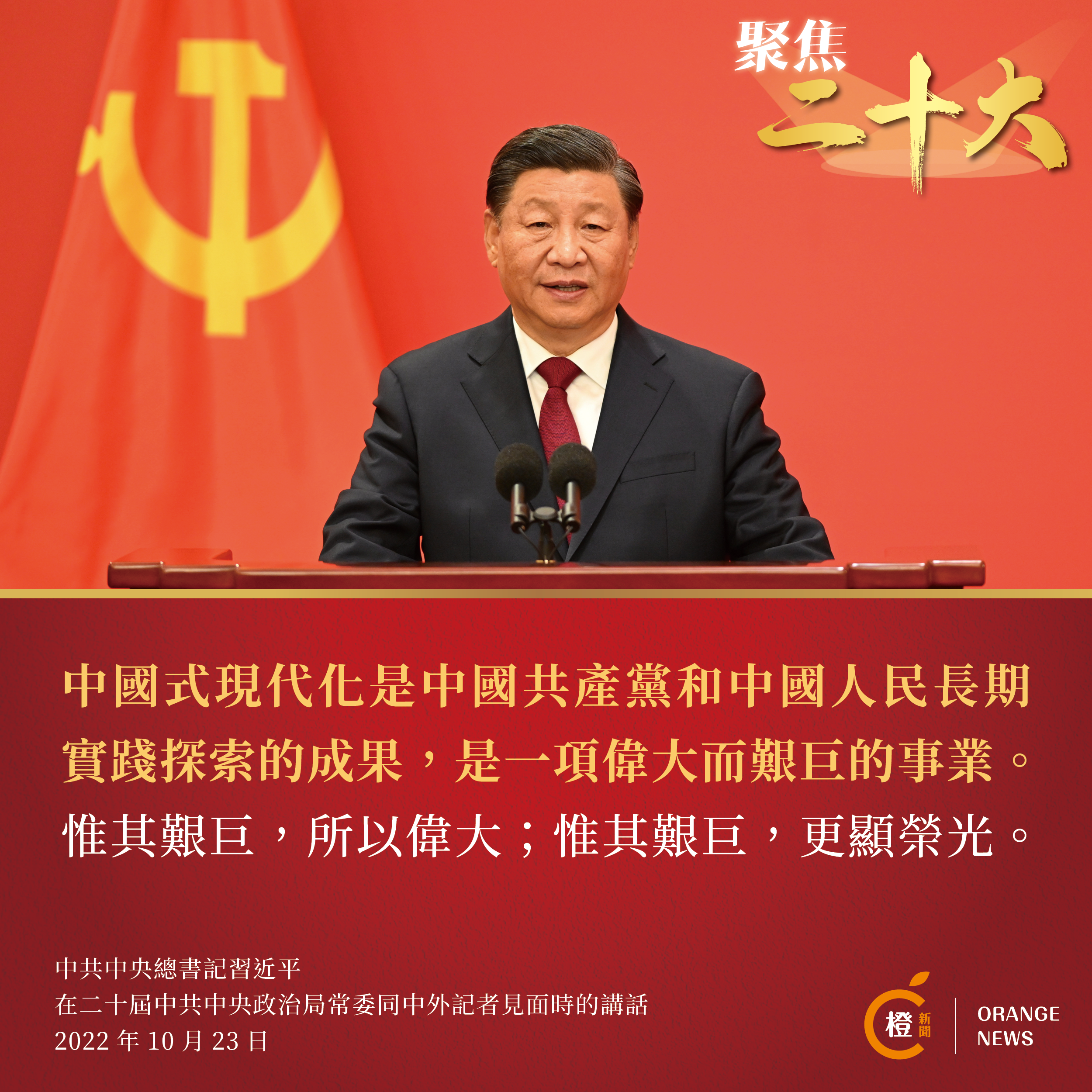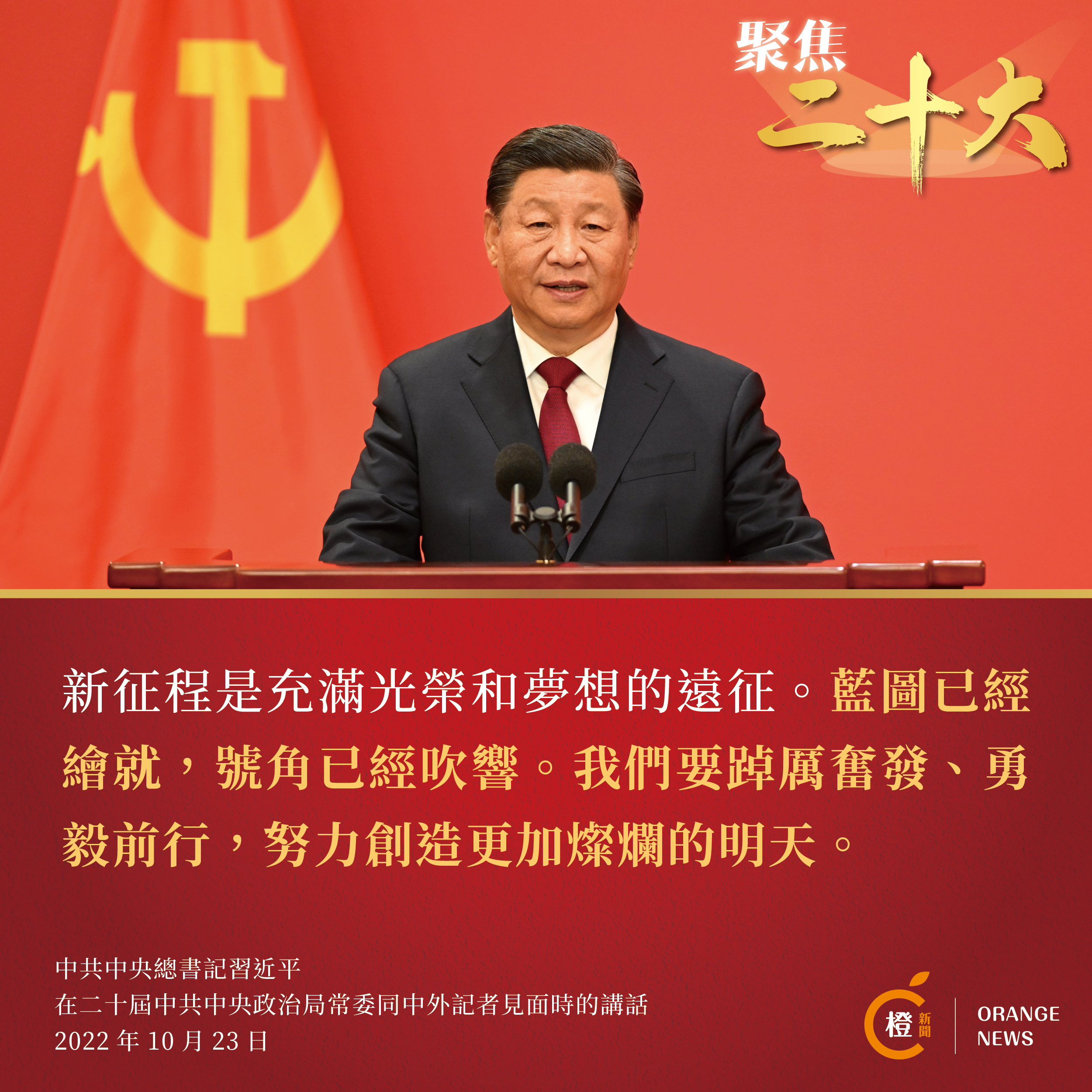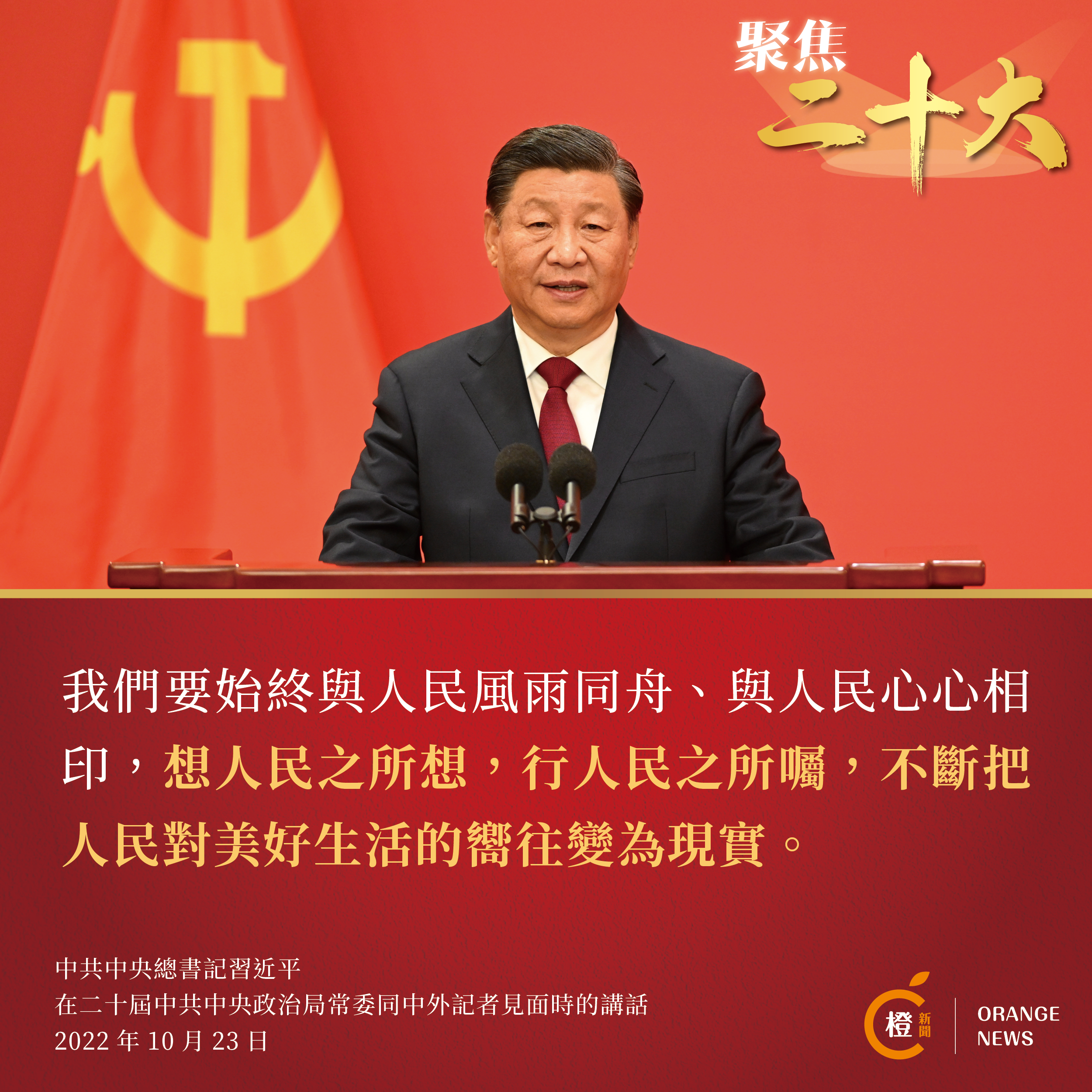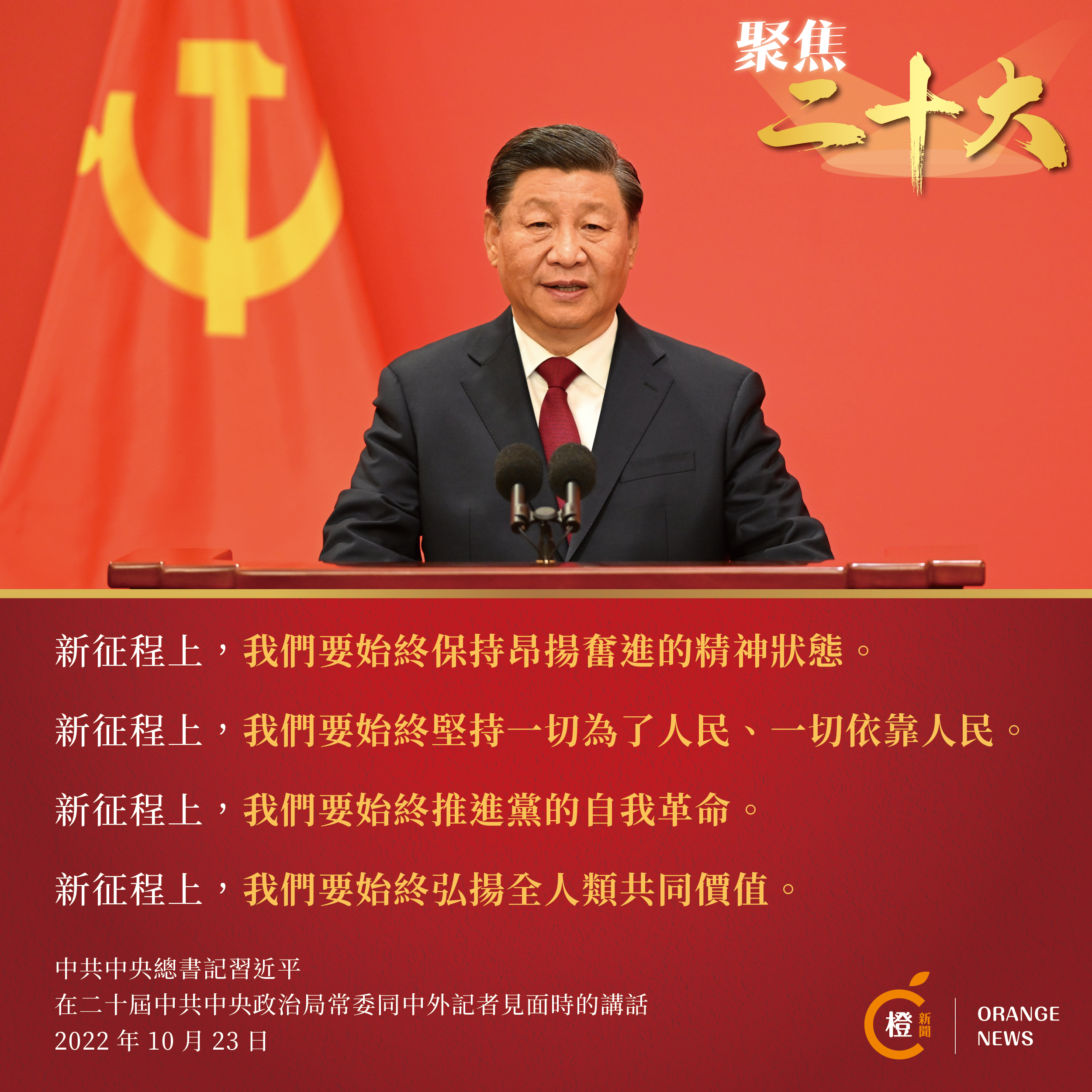 中共中央總書記習近平在發表重要講話時表示,中國共產黨第二十次全國代表大會昨天已經勝利閉幕了,這是一次高舉旗幟、凝聚力量、團結奮進的大會。習近平代表新一屆中共中央領導成員,衷心感謝全黨的信任,強調一定牢記黨的性質和宗旨,牢記自己的使命和責任,恪盡職守、勤勉工作,決不辜負黨和人民重托。