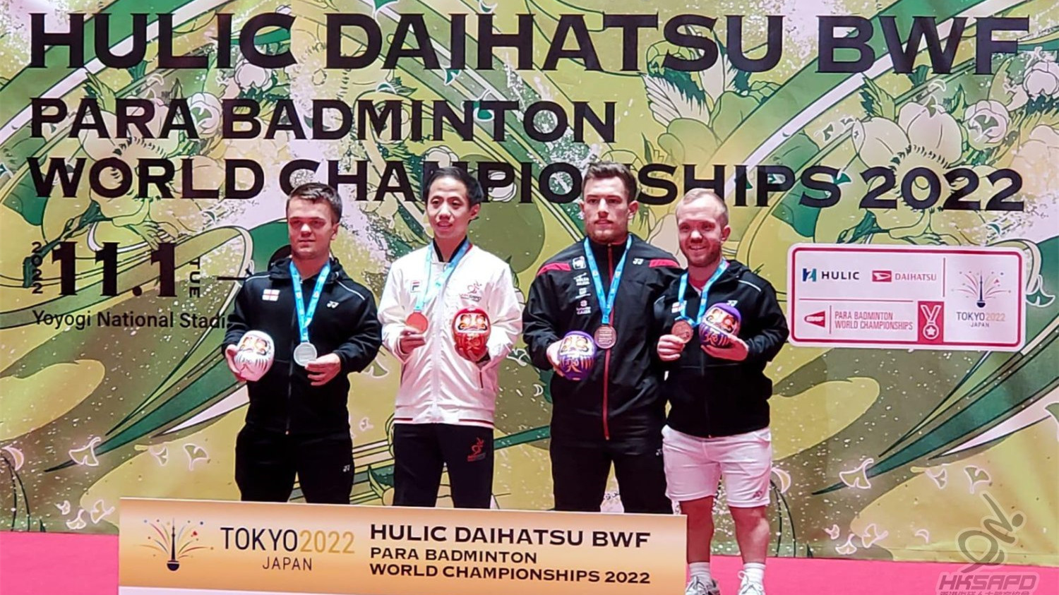 朱文佳(左二)繼在世錦賽奪得金牌,在成為男單「世一」雙喜臨門。