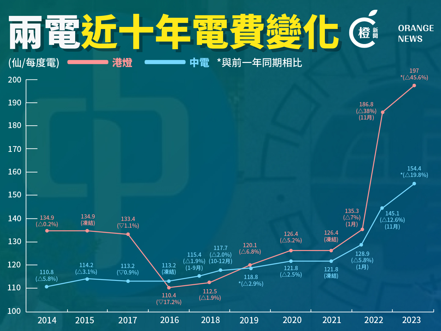 【橙訊】能源價格於近期持續飆升,中電(00002)和港燈(02638)公布明年調整電費計劃,由明年1月1日起,兩電電費將較現時分別上調6.4%和5.5%,如果與今年1月電費比較,中電電費將增加19.8%,港燈增幅更加驚人,上調幅度達45.6%。