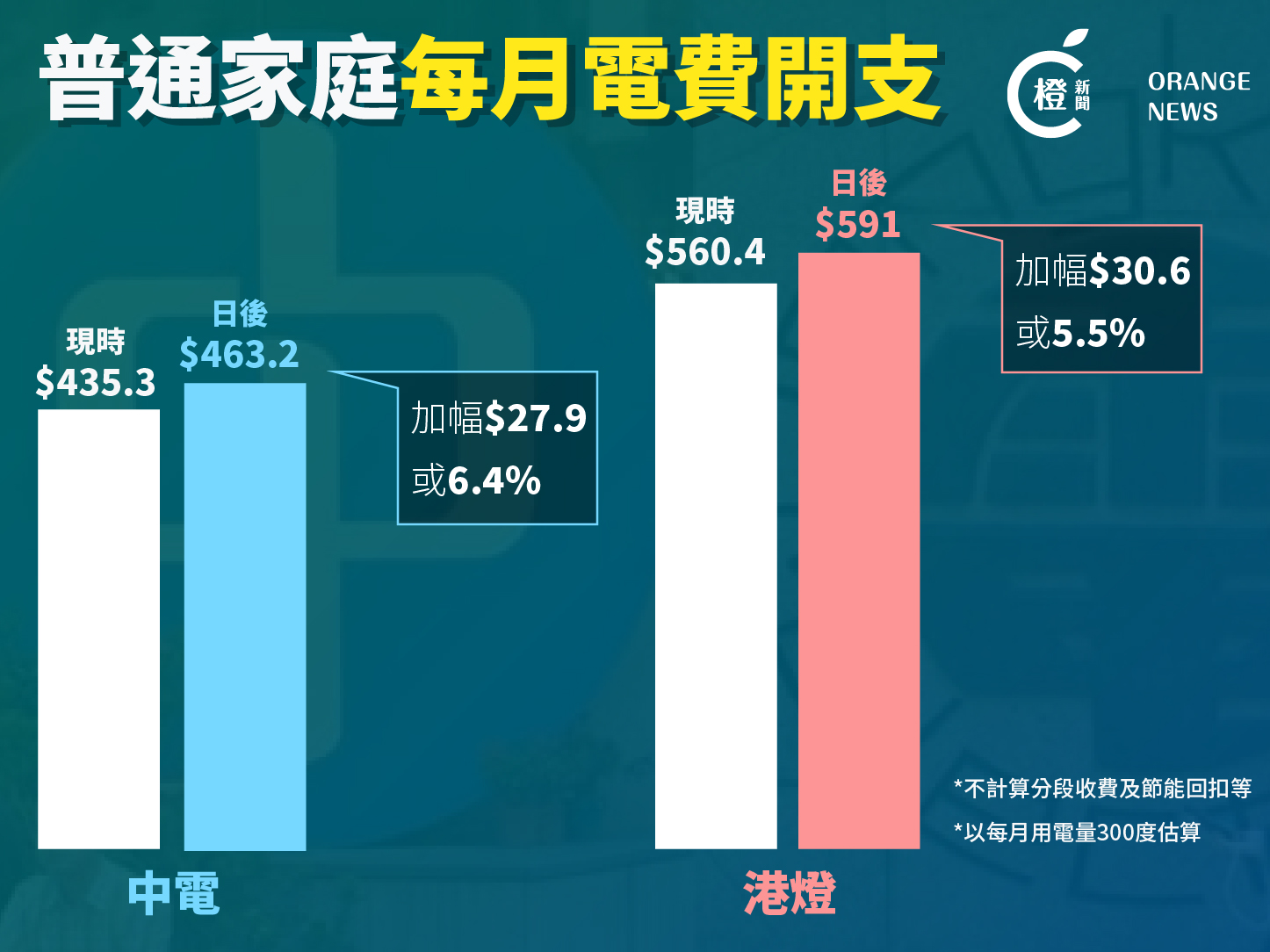 港燈明年基本電價則上調5.5仙,每度114.5仙,燃料調整費則增加3.7仙,增加後價格為每度82.5仙,得出淨電費為197仙,較今年11月增加5.5%,較今年初的135.3仙增加45.6%。以一個家庭每月用電量為300度電為例,現時平均每月電費要435.3元,明年將要多付27.9至30.6元。
