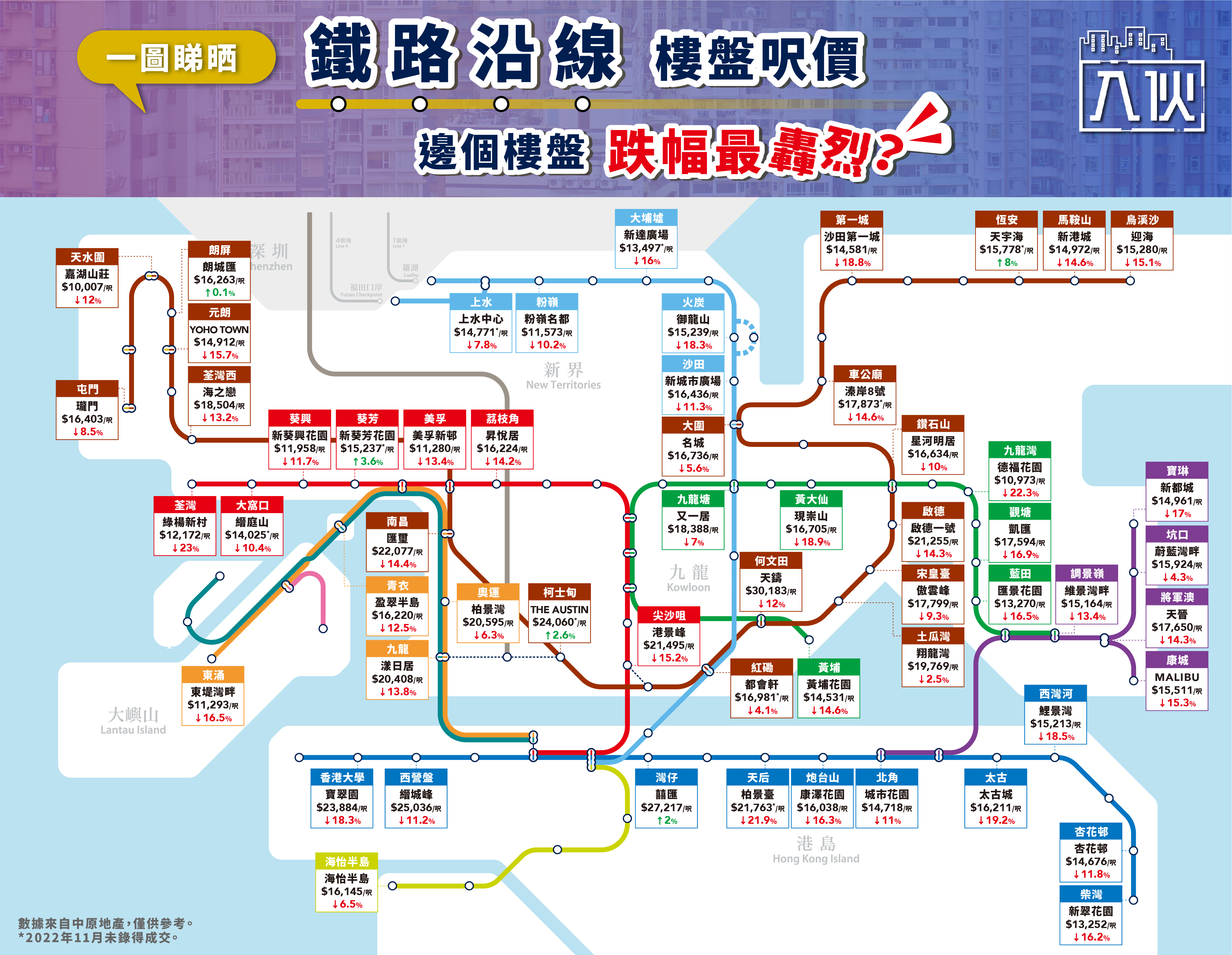 港鐵沿線57個屋苑最新呎價。圖:入伙