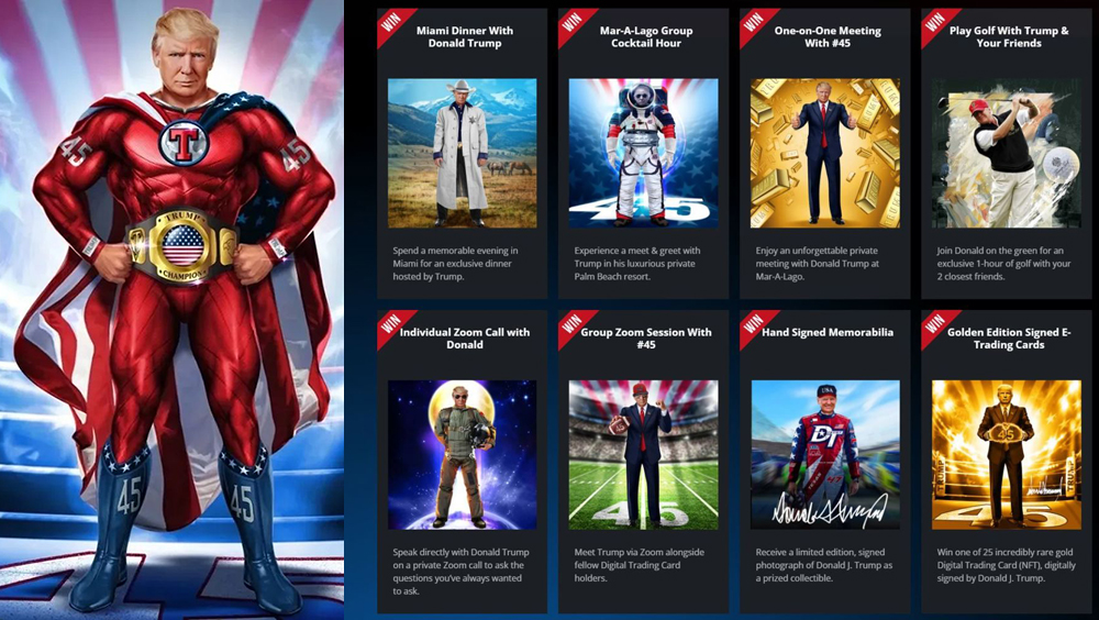 據悉,這批卡片是以NFT(非同質化代幣,Non-Fungible Token)的區塊鏈數碼卡牌形式發售,每張售價99美元。購買卡片的人都將確保獲得一張在佛羅里達跟特朗普共同參加「盛大晚宴」的門票。