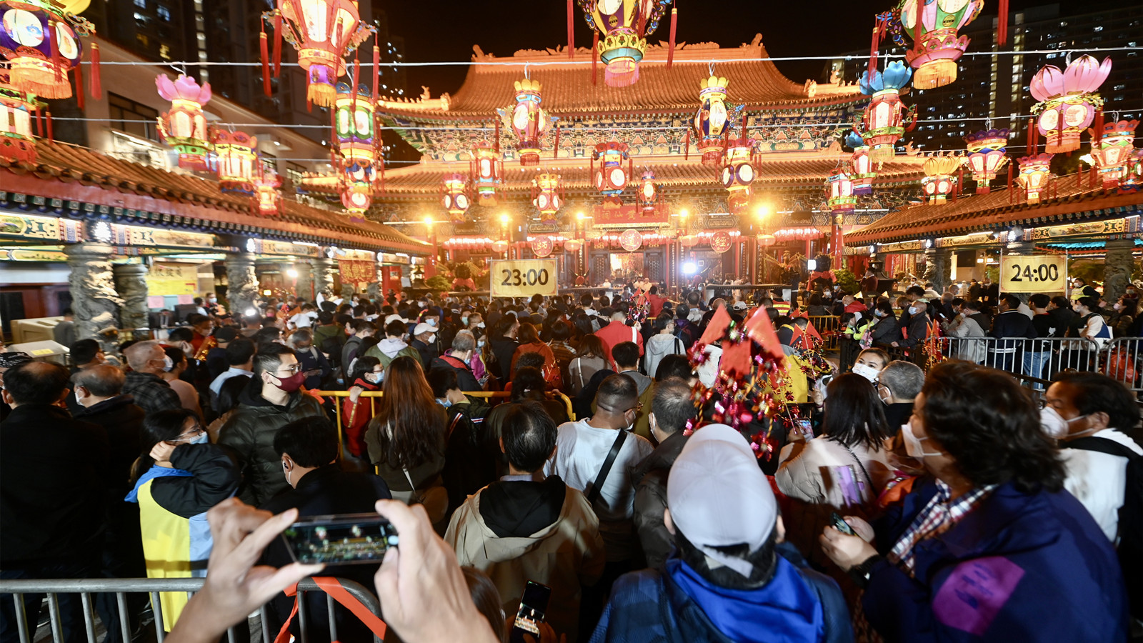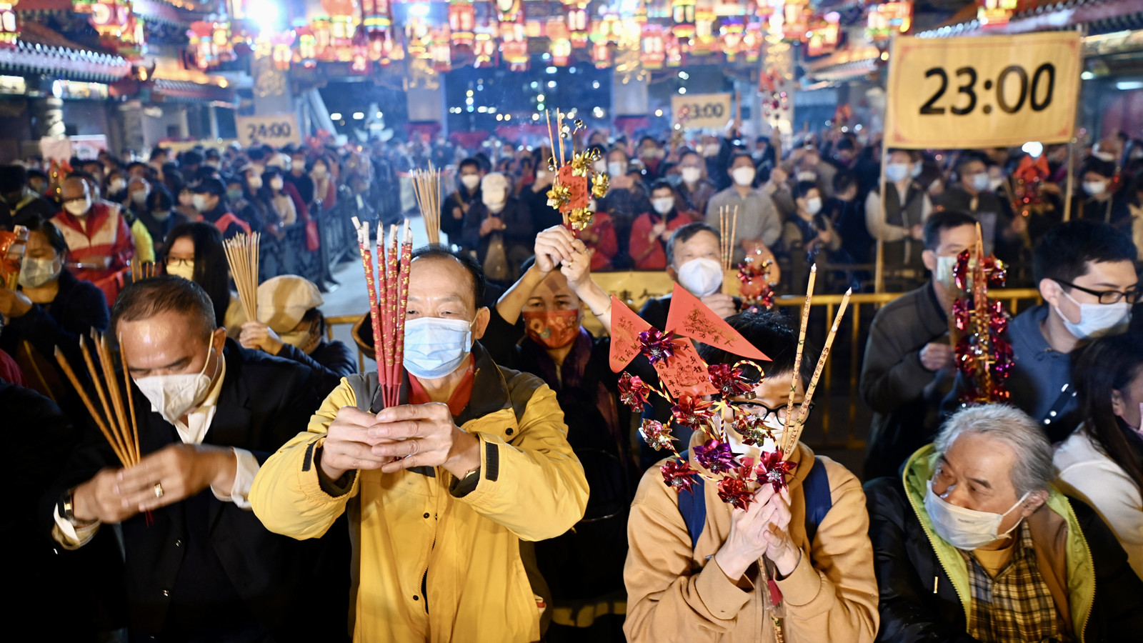 直至晚上11時前夕,「仲有30秒…6、5、4、3、2、1,新年快樂!」各善信迅即在香爐上插香,有人用風車在香燭上撥香,尤如借風送運,亦有人以祭品在香燭上來回順風針圍繞數圈,鐘聲同時在祠廟中響起,「身體健康呀!」新冠疫情過後新一年,成為各人最希望獲得的新年願望。