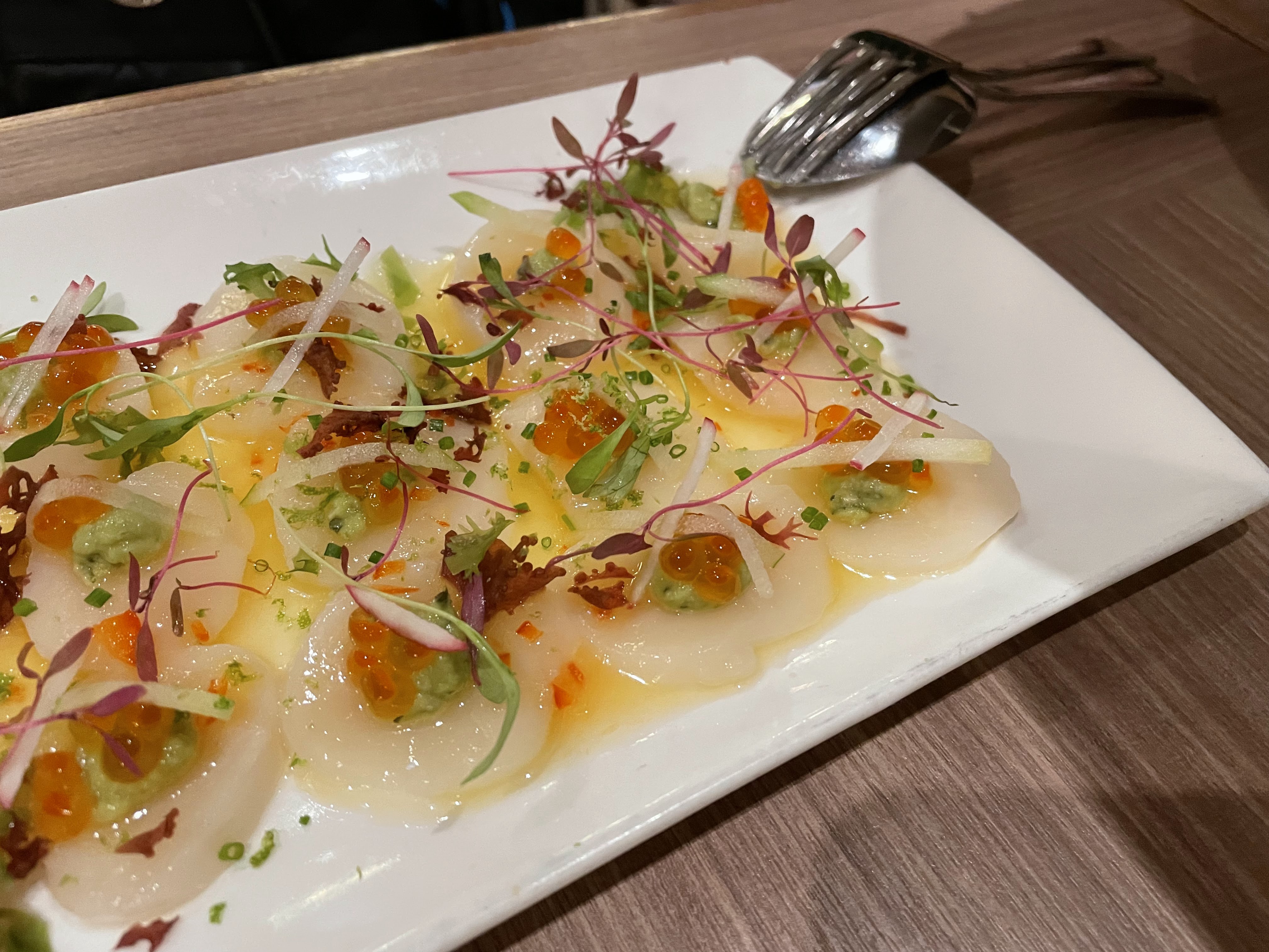 薄切帶子鮮嫩,加入魚子的鹹鮮,與及牛油果醬的香滑,薄薄的醒胃dressing,三味紛陳,似是春天的期待,或夏日的奔放?