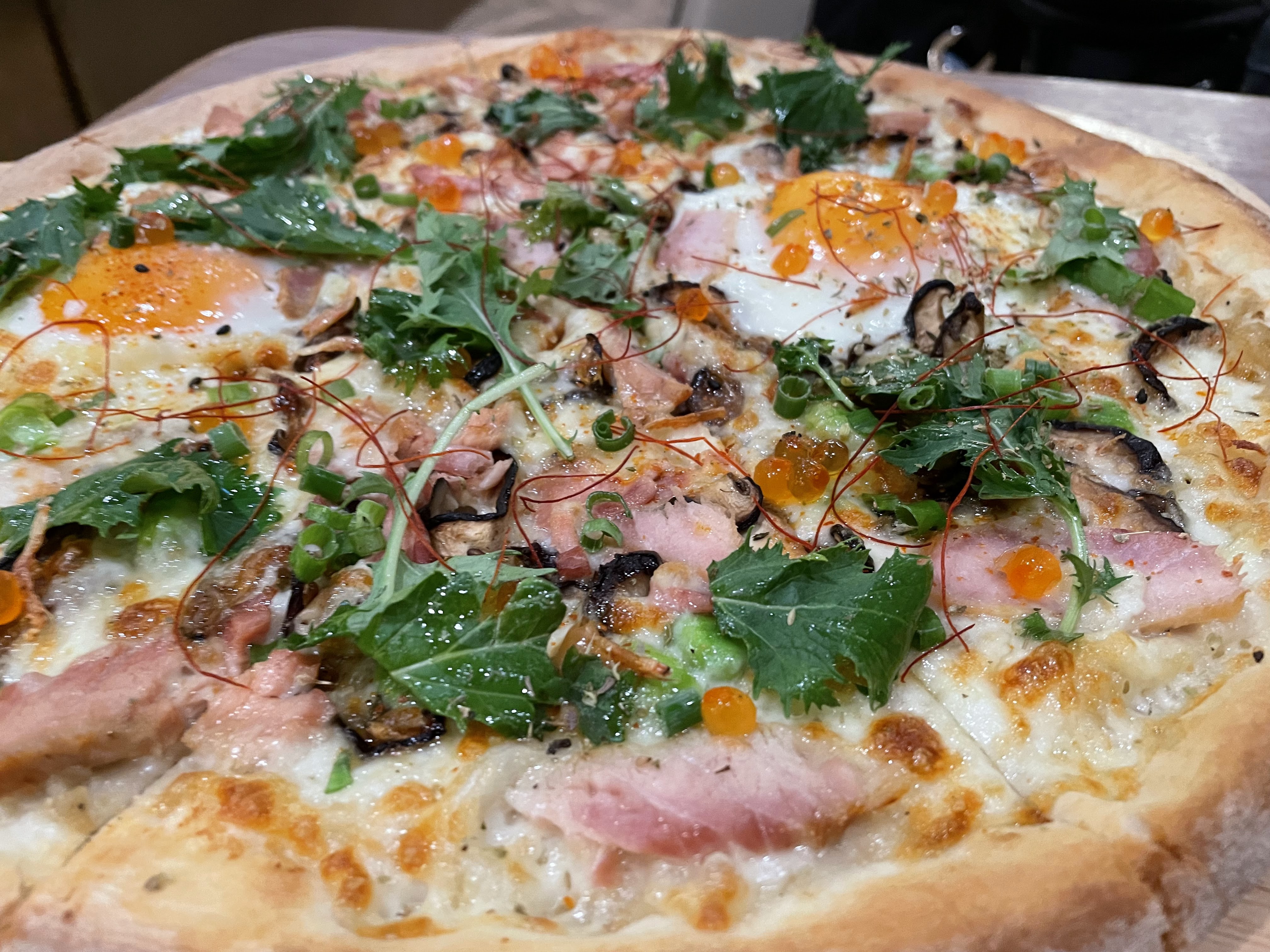 薄餅的風格,絕非美式的厚如鞋底,面頭的芝士亦非嘩眾取寵的拉絲,此煙吞拿魚腩薄餅,配料除了主角吞拿魚腩片之外,還有野菌、三文魚子、日本雞蛋等等,薄薄芝士層,點到即止的鹹香作出適當的襯托,焗過的吞拿魚腩,煙香味更出,弄破面頭的蛋黃,讓蛋汁流出變得更甜美可人。