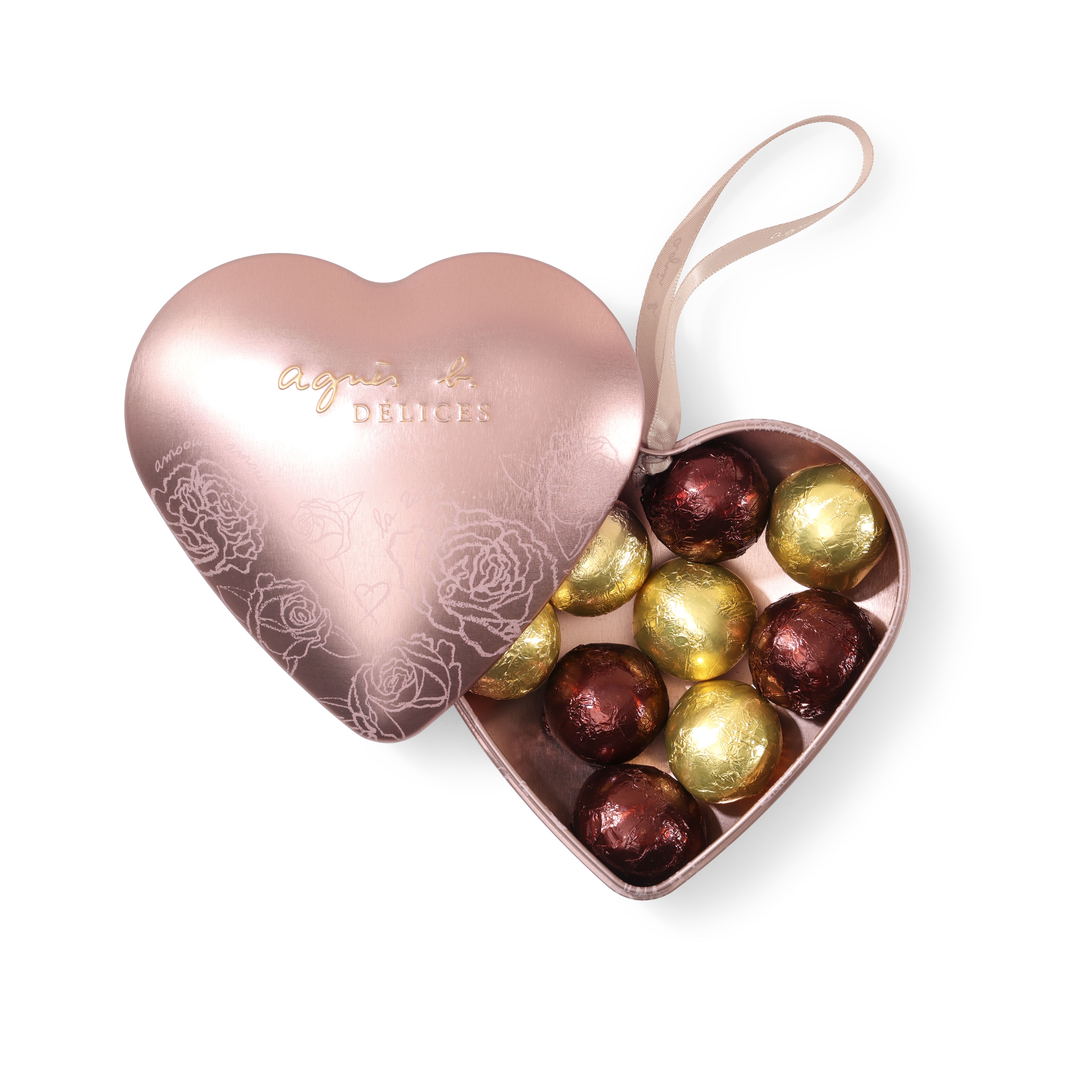 agnès b. DÉLICES的心形朱古力禮盒可自由配搭不同松露或夾心朱古力,包括新口味粉紅色心形玫瑰夾心朱古力,或選擇限定口味,包括果仁醬脆皮牛奶朱古力配搭果仁醬脆皮黑朱古力,或焦糖果仁醬朱古力配搭馬達加斯加黑朱古力兩個款式。