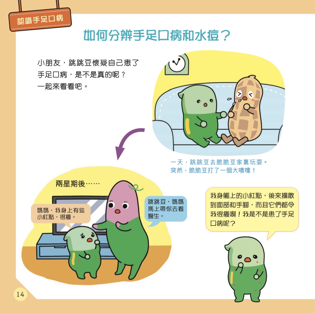 肺炎、流感、手足口病都是常見疾病,特別是手足口病,更是兒童常見疾病。教導孩子建立衞生意識,有助他們遠離這些疾病。本書從孩子的角度出發,除了由可愛的豆豆介紹一個個豐富而且程度適中的健康常識外,也透過走迷宮、塗顏色、找找看等趣味元素,將知識融入遊戲中,讓孩子輕鬆學習。