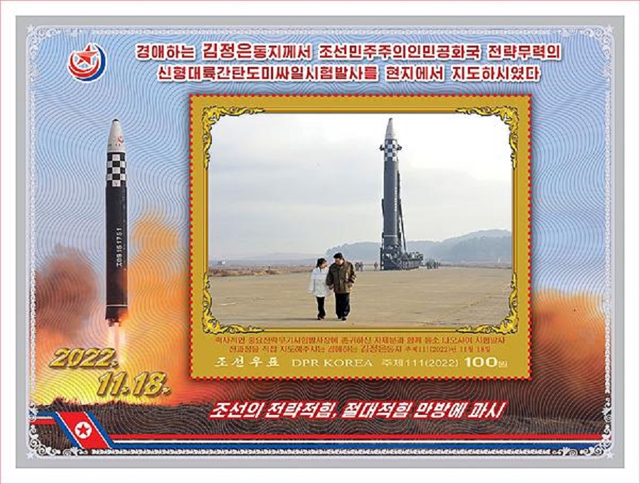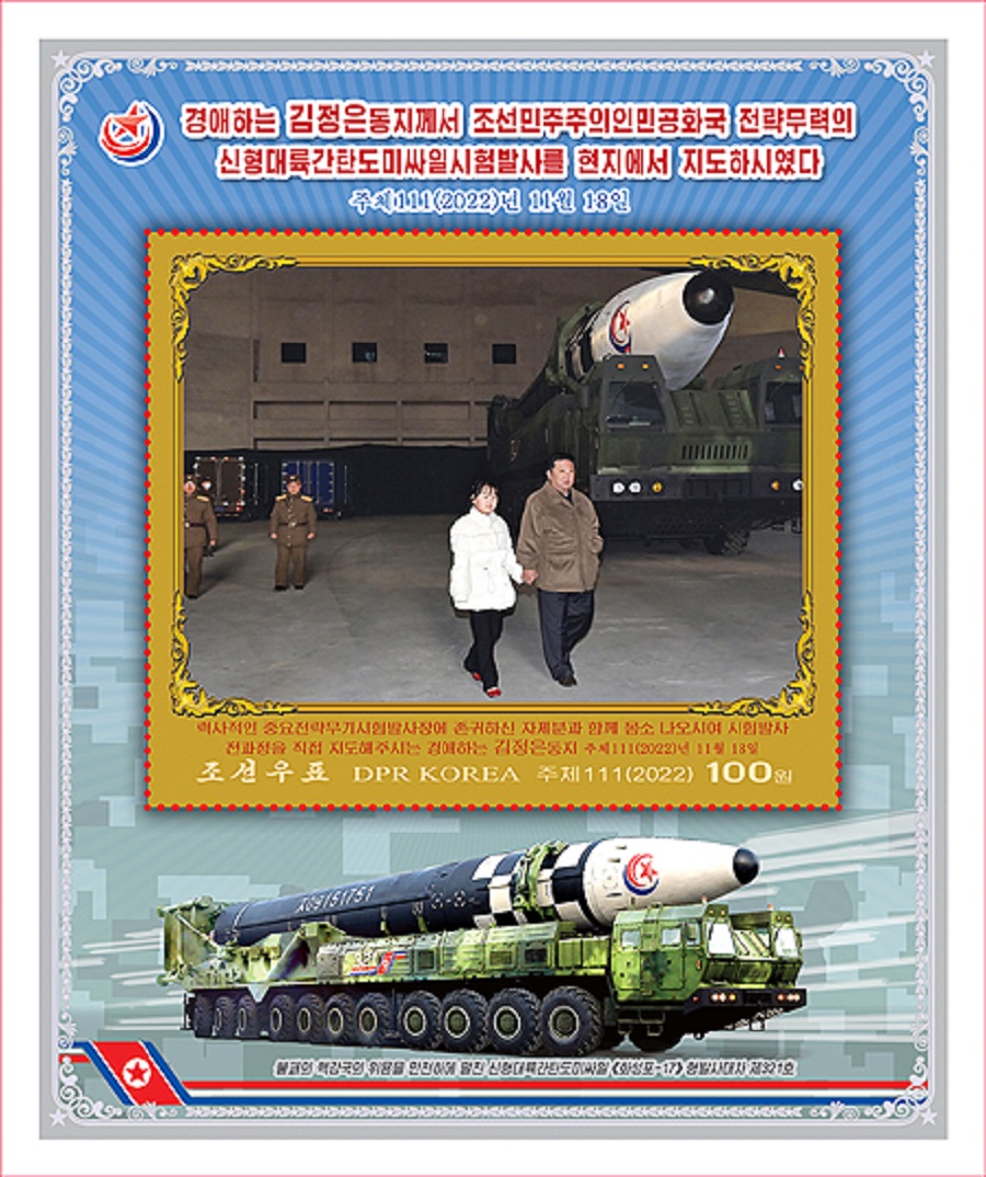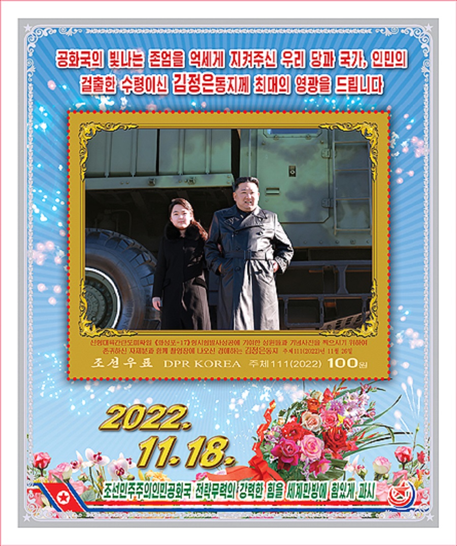 《韓聯社》報道,金正恩的女兒亮相其中5種郵票,二人的照片背景多為導彈,或手牽手並排走,或挽著手臂拍照,或與士兵合影。其餘3種郵票中,還有1種是金正恩的照片,有2種是導彈照片。