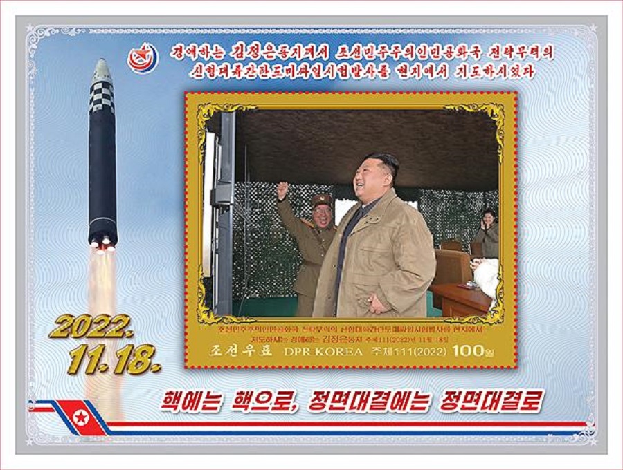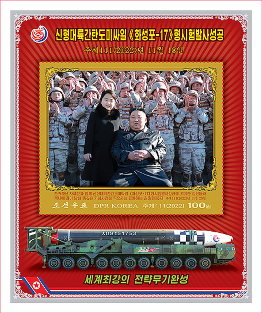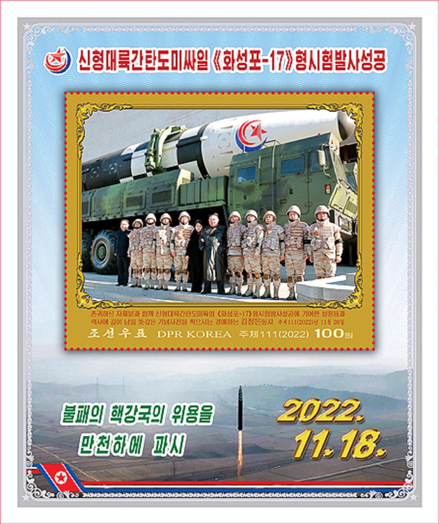 北韓郵票社指,這組郵票主要是與「火星—17」型新型洲際彈道導彈試射成功有關,共有8種類型。