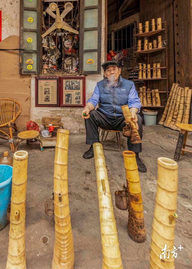 大碌竹(水煙筒)在赤坎歷史悠久,如今許多年輕人將其作為藏品收藏。鄭木森老師傅與大碌竹結緣多年,圖為他與親手制作的大碌竹