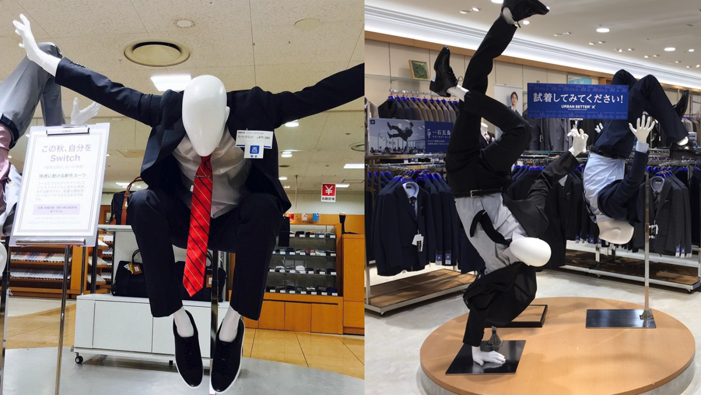 【橙訊】假人模特兒最大的作用就是站著示範衣著配搭,直立太普通了嗎?近日網上再度瘋傳一輯日本西裝店創意假人模特兒的照片,多個假人模特兒擺出各種搞怪動作,街舞、輕功等,令人大讚「有創意」。