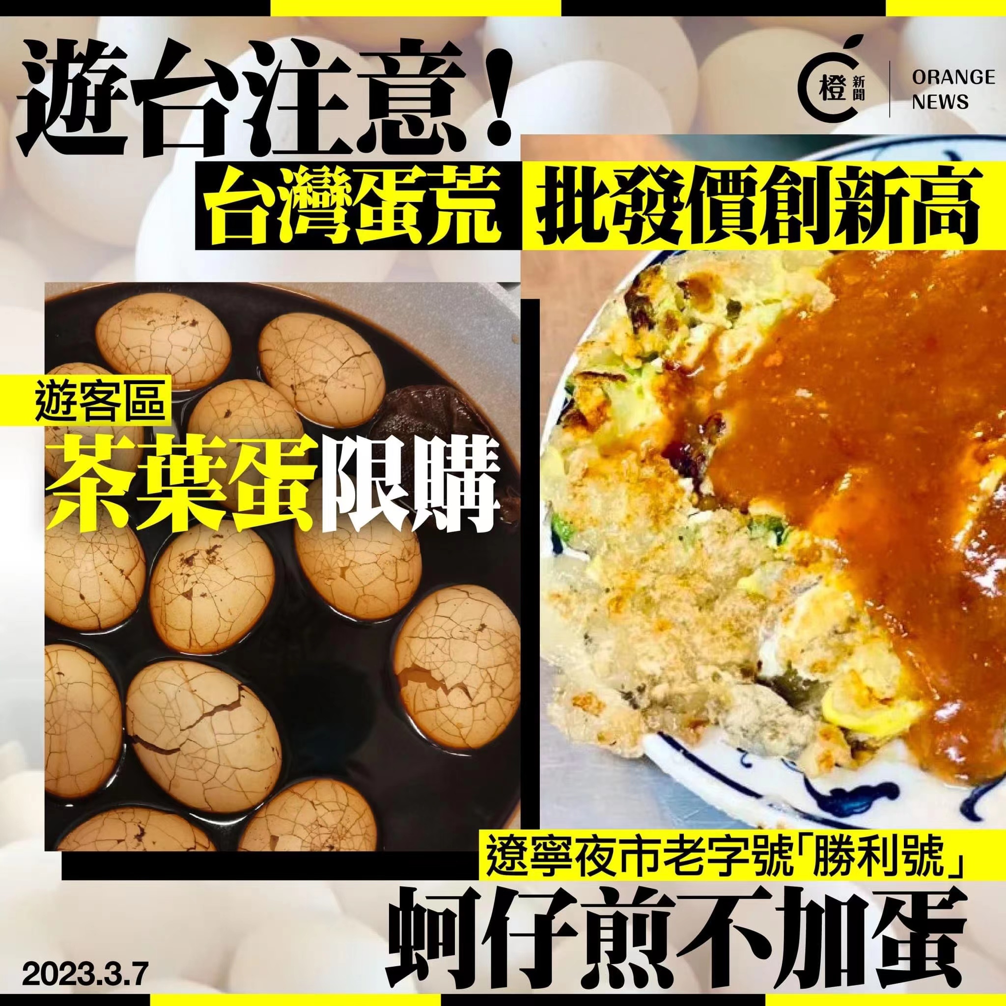 【橙訊】受禽流感影響,台灣持續出現雞蛋荒,據台媒報道,昨日(起雞蛋批發價從每台斤52元(新台幣、下同)調整為55元,漲幅5.8%,再創新高。缺蛋問題嚴重,台北遼寧夜市老字號「勝利號」宣布,蛋煎、滷蛋及蛋花湯等三項食品昨日起停售,蚵仔煎亦無蛋可加;南投日月潭紅茶觀光工廠也限購茶葉蛋數量,一人只能買兩顆。