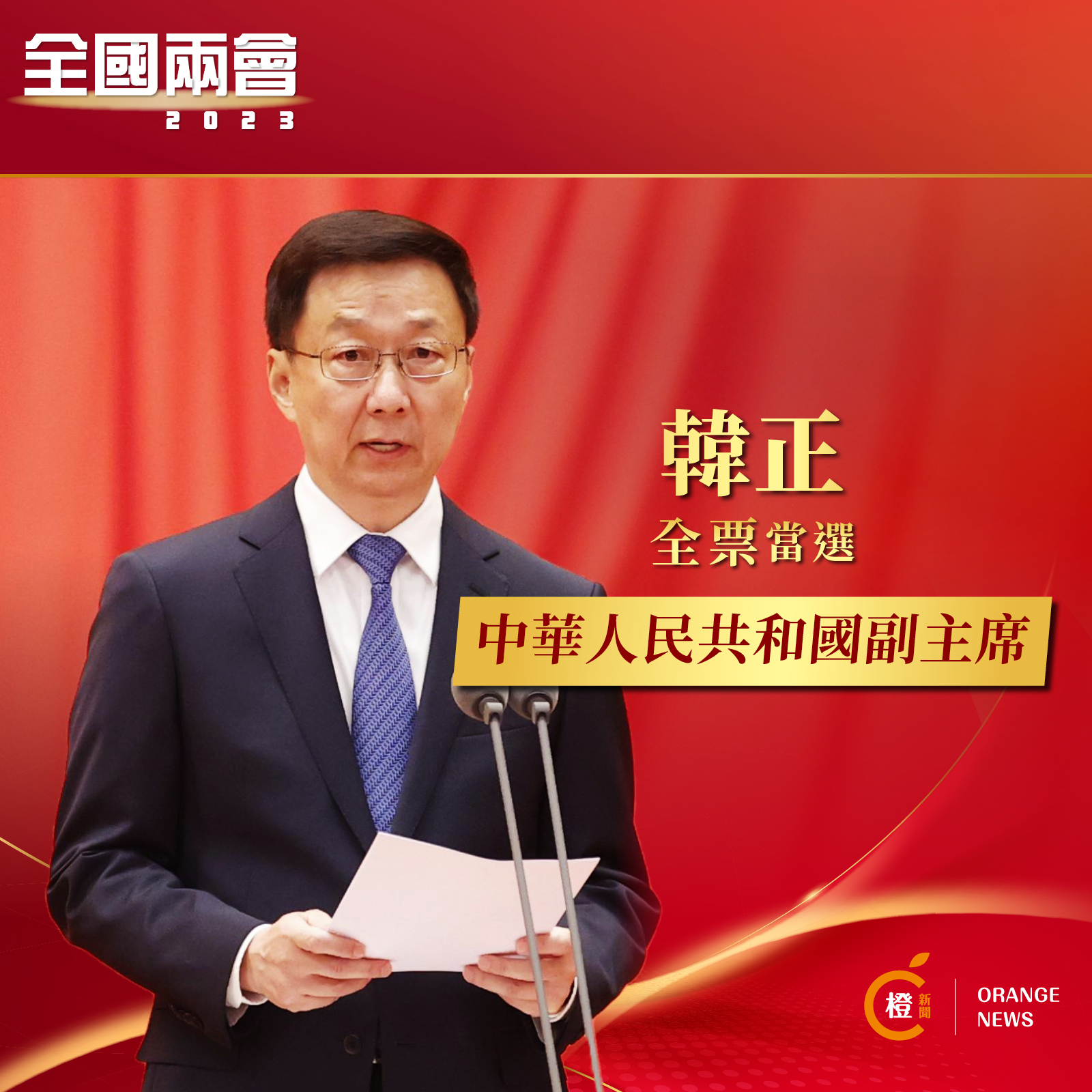 【橙訊】十四屆全國人大一次會議第三次全體會議今日召開,韓正全票當選為中華人民共和國副主席。
