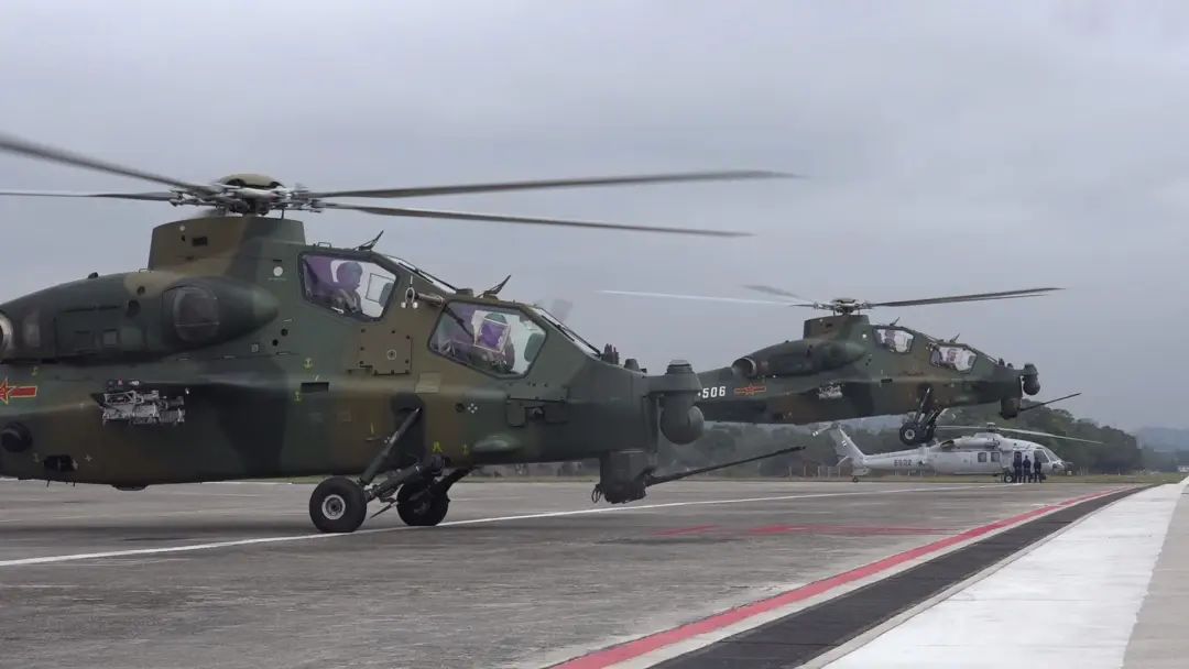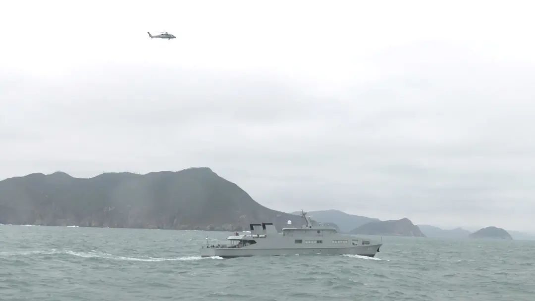 10時許,海空聯合編隊巡邏至目標海域,直升機發現模擬「可疑船隻」,快速機動至其上空,喊話逼停,並引導艦艇編隊對該船隻進行攔截。