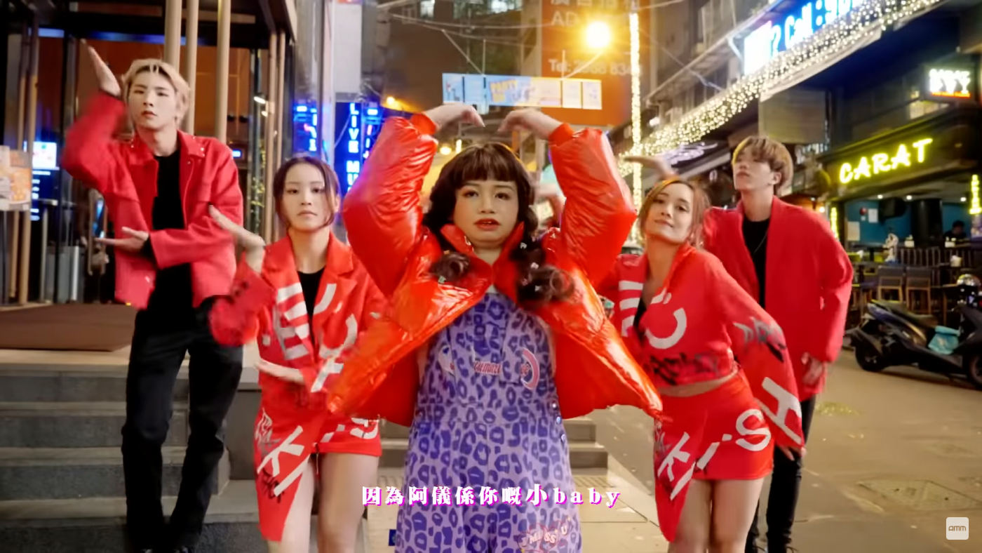 歌詞「因為阿儀係你嘅小baby」配合阿儀的心型姿勢相當亮眼。(圖:AMM 亞洲心動娛樂 Hong Kong@YouTube影片截圖)