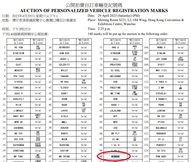 由於運輸署規定,所有自訂車牌號碼不得包括「I」、「O」及「Q」,因此MIRROR只能以「M1RR0R」作為組合。根據運輸署當日的拍賣安排,「M1RR0R」將在當日的下午時段,拍賣順序為第90號。所有自訂車輛登記號碼的底價為5000元。已繳交5000元按金的申請人仍須出席拍賣會並須參與競投(包括競投第一口價),否則所申請的自訂車輛登記號碼可能會以底價售予另一競投人士。