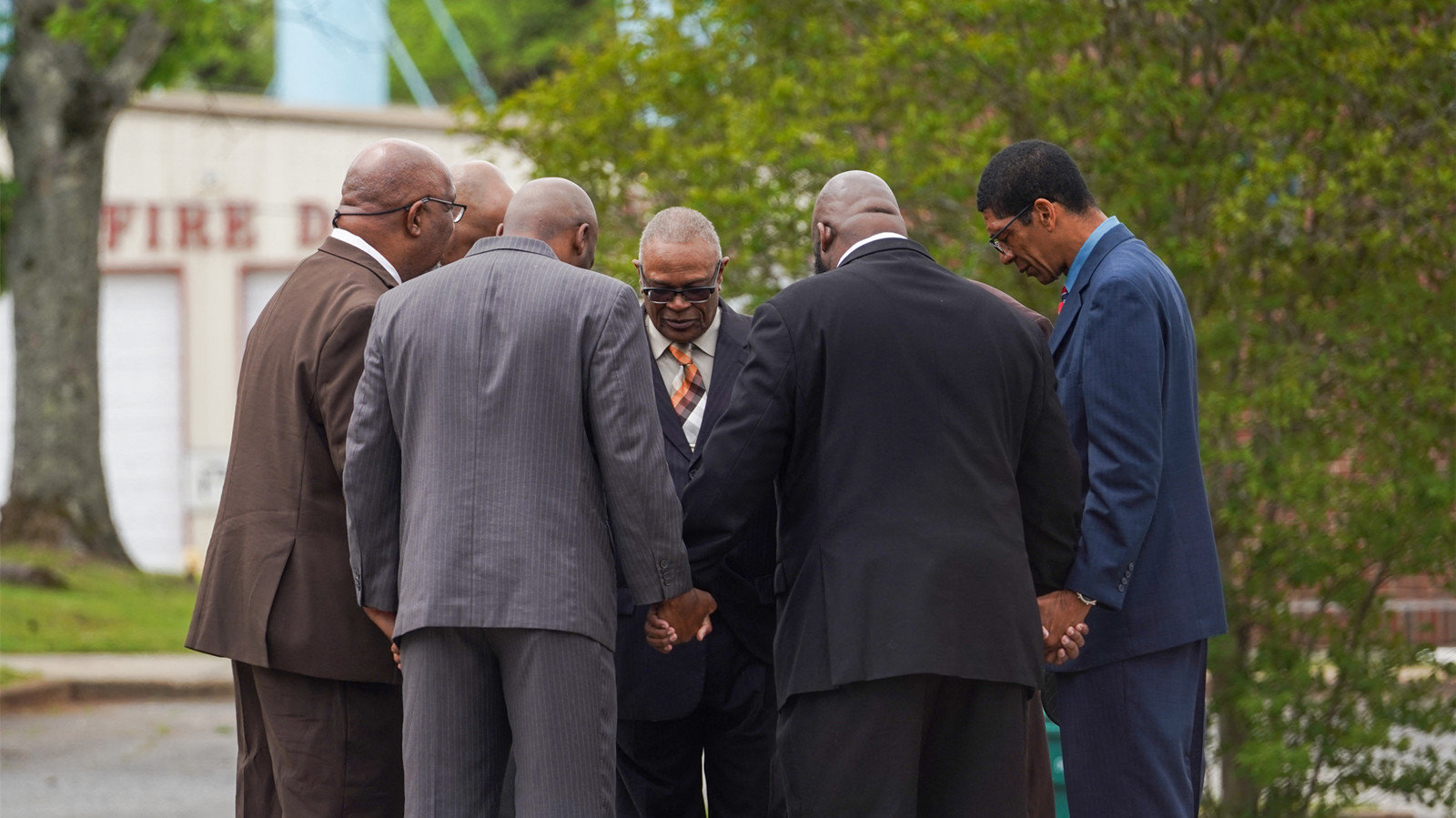 社區及宗教領袖在阿拉巴馬州戴德維爾市現場外祈禱,悼念槍擊案中的死傷者。