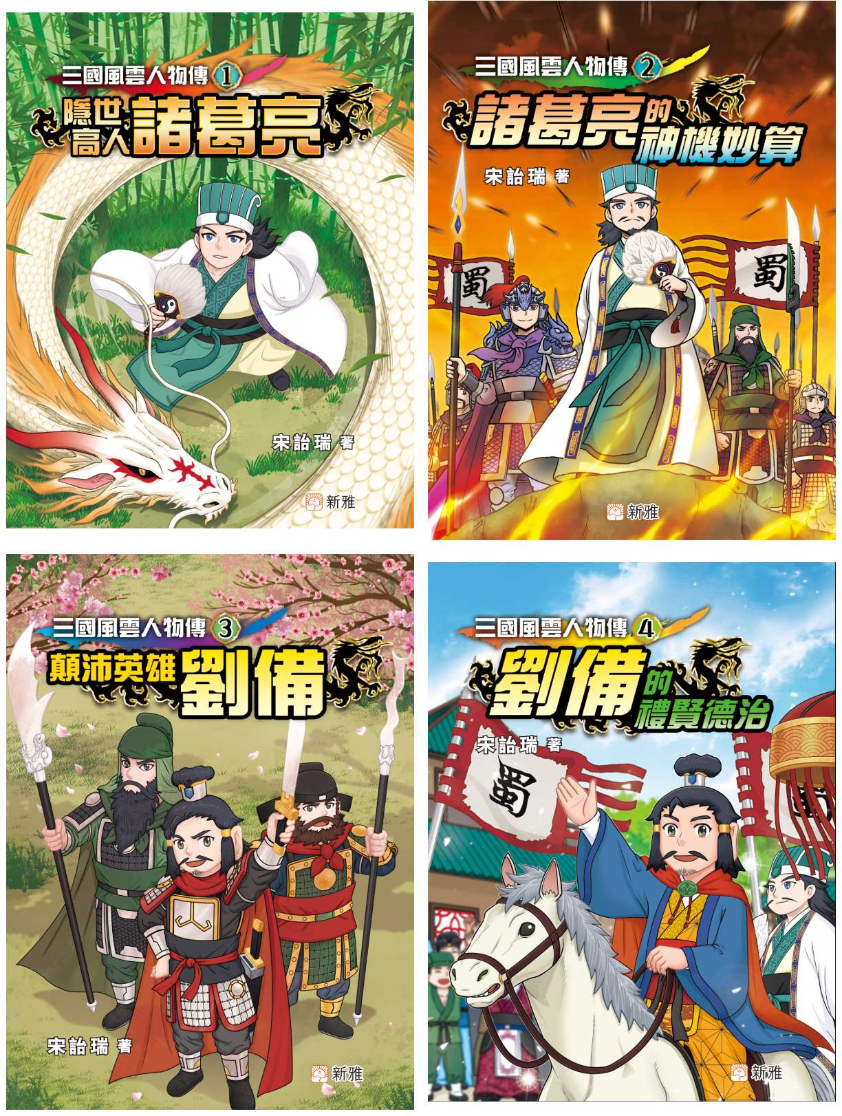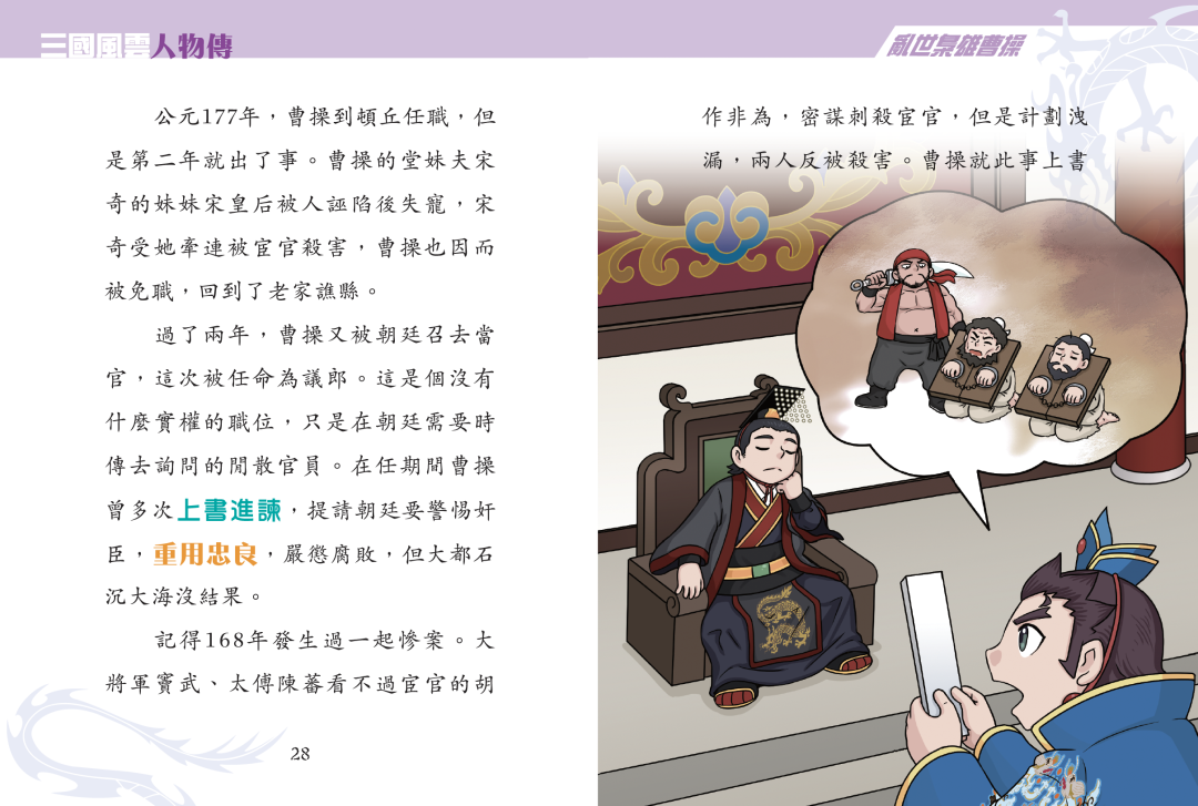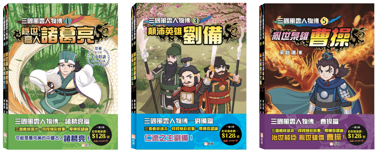 本系列以三國時代的重要人物為主角,例如:第一、二冊集中講述隱世高人諸葛亮;第三、四冊主要描寫顛沛英雄劉備;第五、六冊則以亂世梟雄曹操為核心角色。小讀者可以一邊看故事,一邊認識三國時期的事件。