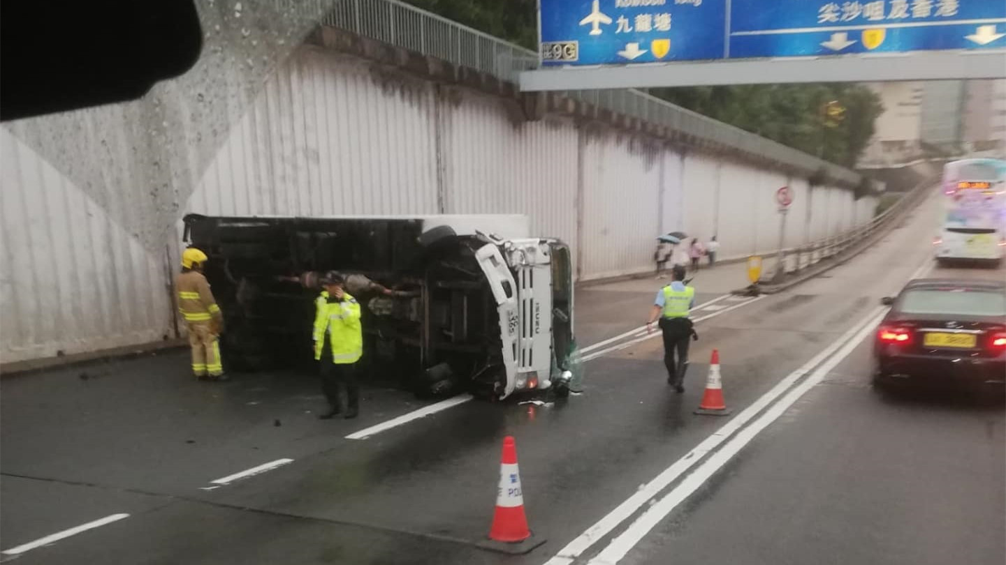 消息指該名40歲男司機在早上約6時35分駕駛一輛密斗貨車,沿九龍塘窩打老道往九龍方向,途至映月臺對開時,疑天雨路滑致撞向欄杆並翻側。司機一度被困,在在消防協助下離開車廂,送院治理。