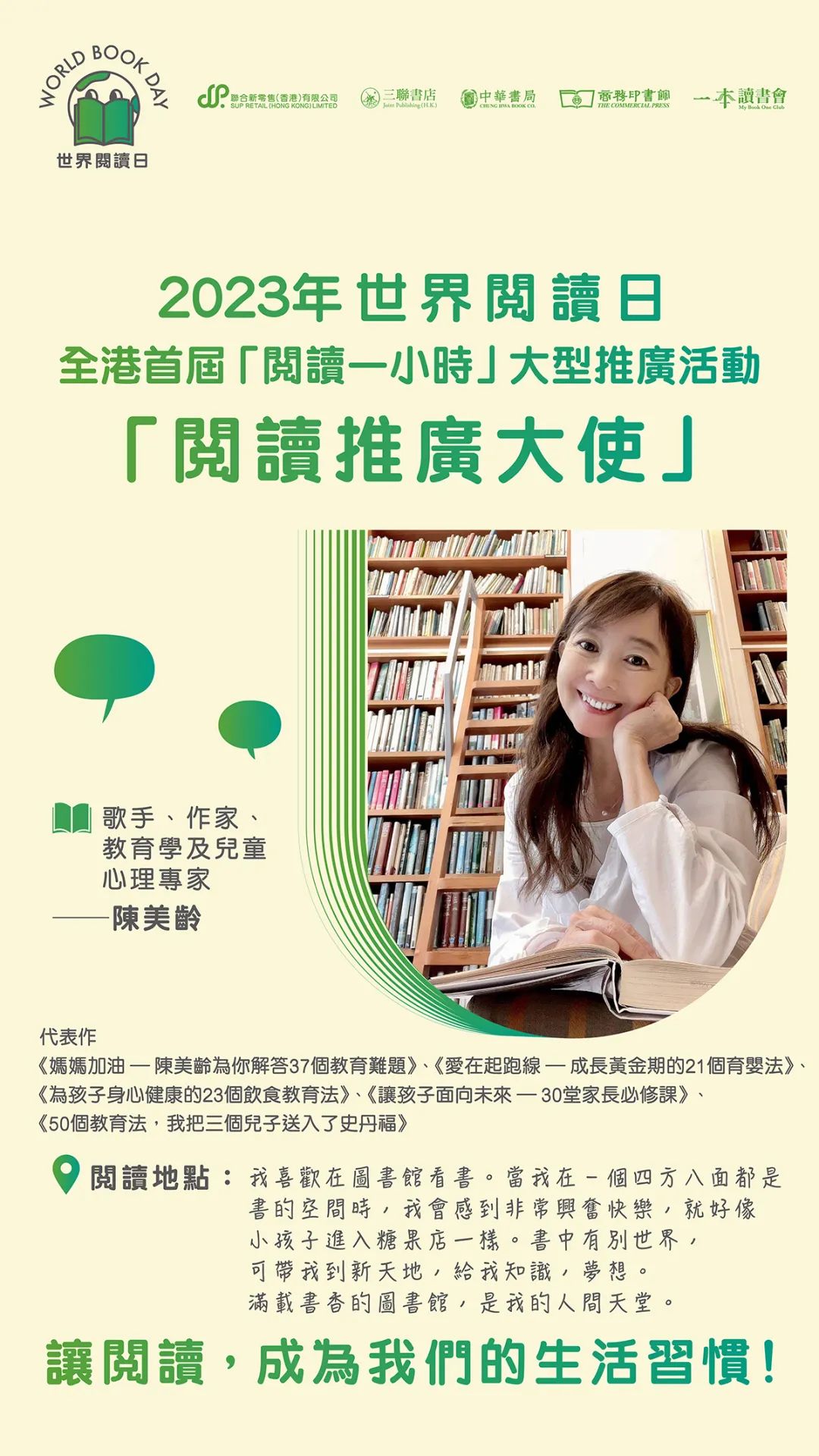 名家閱讀推廣大使公開私藏閱讀地點 號召全民隨時隨地「閱讀一小時」
