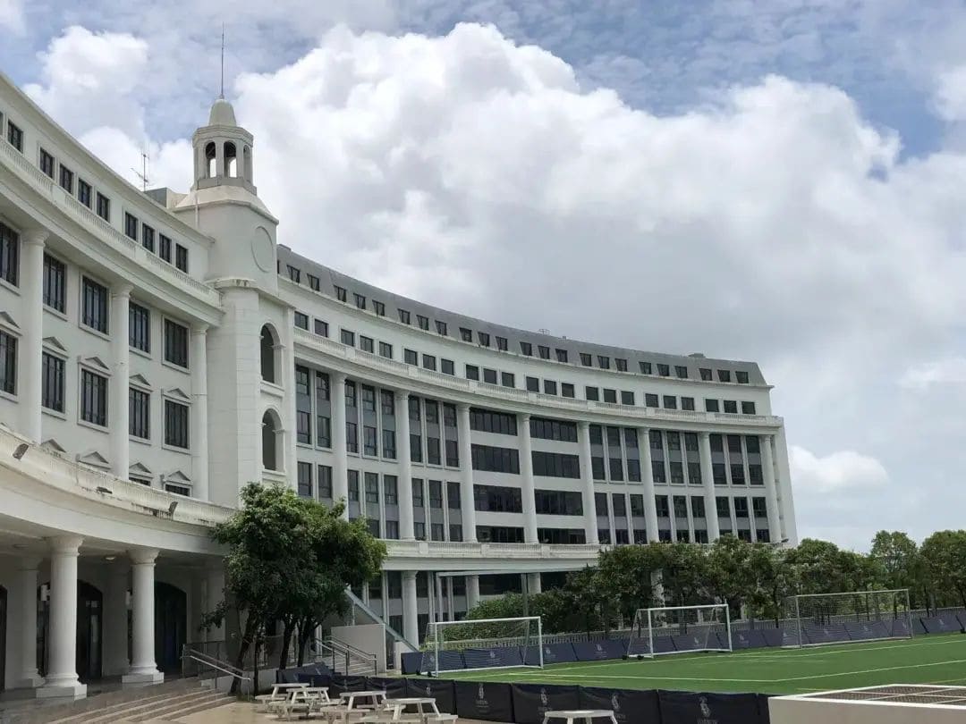學校正門口。純白色、呈弧形的外牆,英倫校園風撲面而來。(女王實拍)
