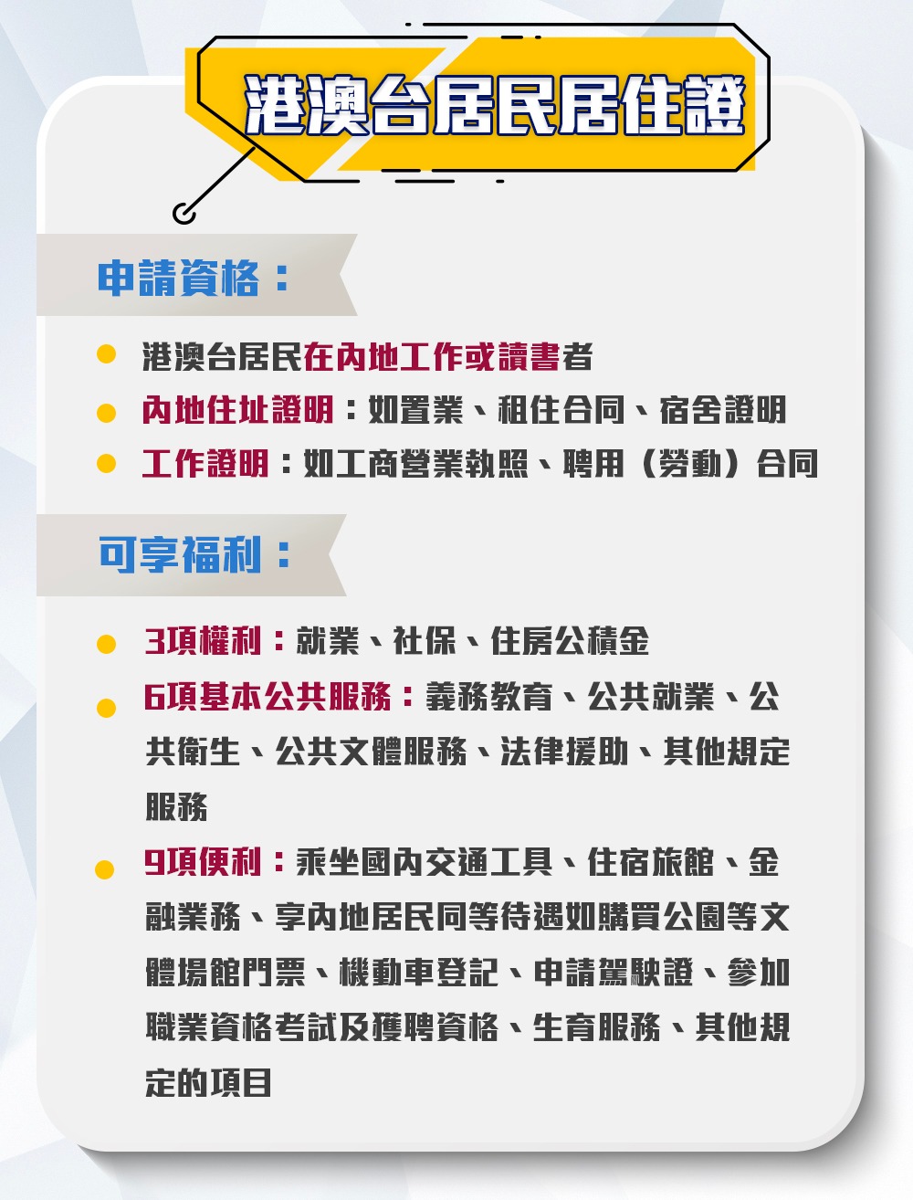 國務院於2018年8月發佈《港澳台居民居住證申領發放辦法》,讓香港、澳門、台灣居民在內地居住6個月以上,可以申請領取「港澳台居民居住證」,享受「3項權利、6項基本公共服務、9項便利」,是推動港人北上大灣區發展的重點政策,便利港澳居民北上。