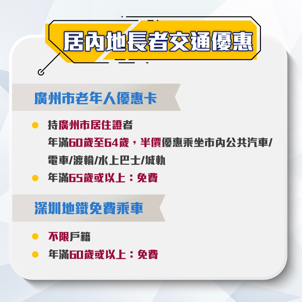 長者在大灣區生活及養老的話,也可以享有不少的交通優惠政策,讓長者出遊更方便輕鬆!