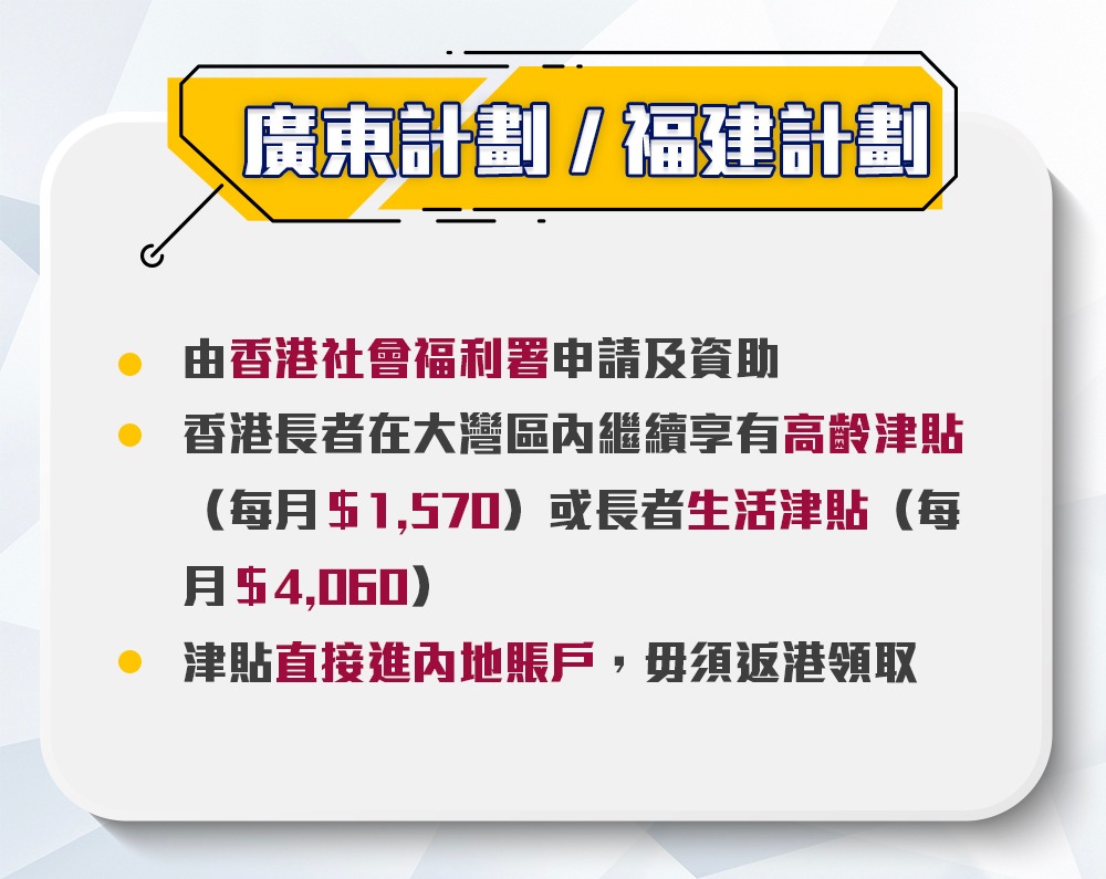 廣東計劃及福建計劃,實際就是香港社會福利署「高齡津貼」和「長者生活津貼」的延續版。計劃的目的,是讓一直在香港領此津貼的長者,一旦選擇移居內地,也能夠繼續領取這些津貼。