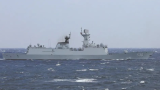 央視畫面顯示解放軍艦艇昨抵花蓮外海 可看見島上山脈及建築物