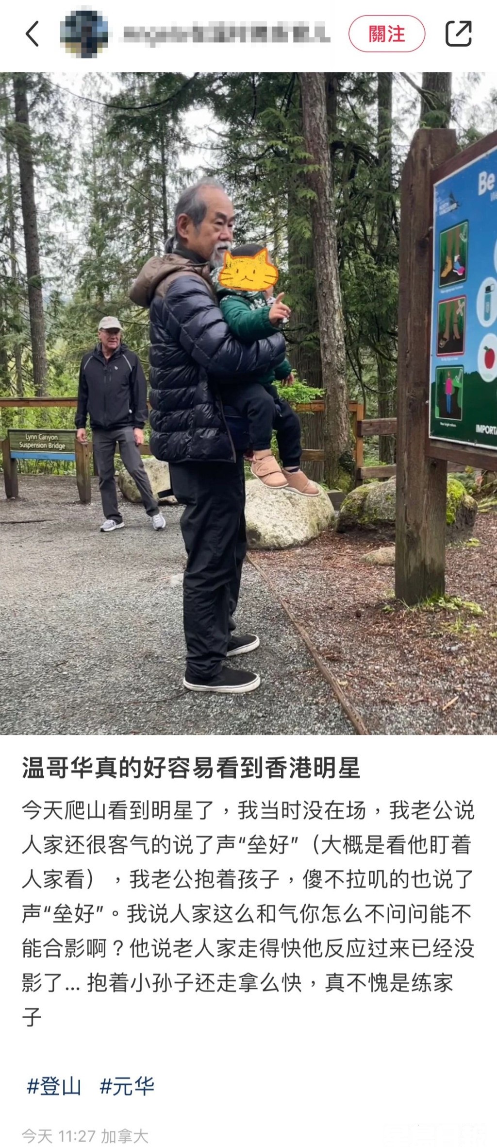【橙訊】早年,元華移居加拿大生活以弄孫為樂,並於近年逐漸減產。今年1月元華曾返港現身動作特技演員公會春茗,雖然身形稍為清減,不過精神不錯。近日,現年72歲的元華更在溫哥華抱住年約2歲的孫仔登山時被網民「野生捕獲」,網民還笑言元華似用輕功走,抱着孫仔也行得超快,不愧為練武之人。