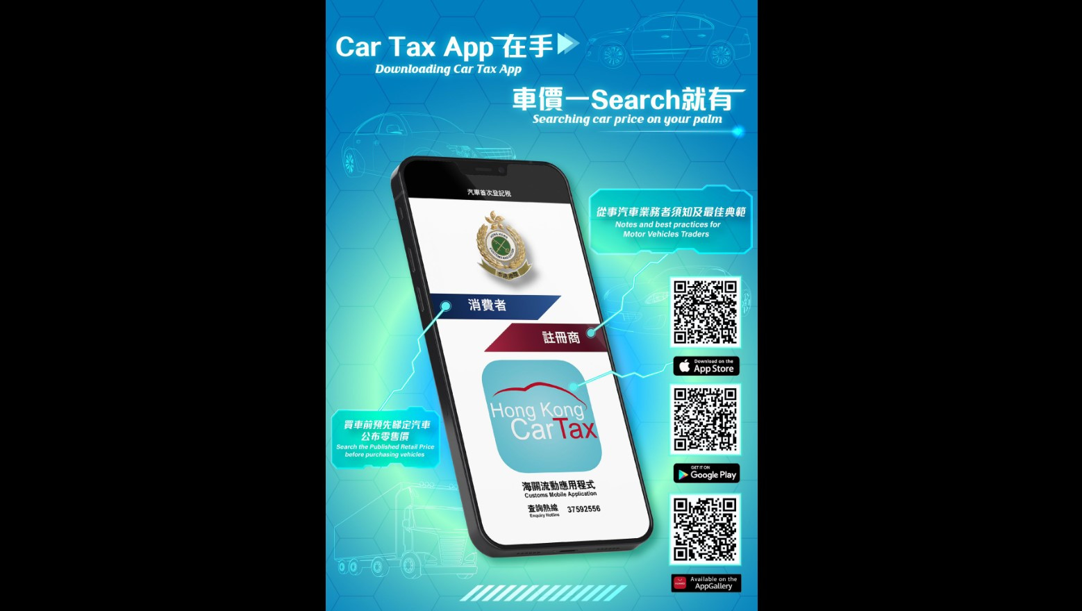 海關建議市民在購買首次登記汽車前,下載「HK Car Tax」應用程式,查清心儀車款的已核准公布零售價,避免受騙,買入貴車。市民若發現有不法商人以高於已核准的公布零售價格出售汽車,可向海關舉報。