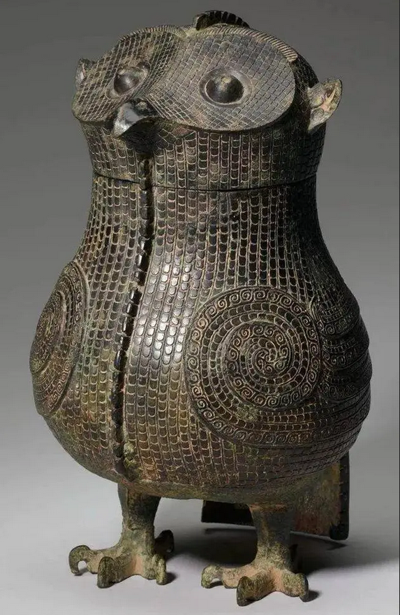 「鴞」即貓頭鷹,在商代非常受推崇,有不少祭祀用品為鴞形。據博物館官網介紹,青銅鴞尊分為兩個部分,可拆卸的貓頭鷹蓋頭和空心的身體,器物高0.318米,重約3.7千克。據悉,該青銅鴞尊是現存的最古老、最自然的鴞尊之一,也是目前存世的體積最大的鴞尊之一,有相當高的文物價值。它是古董收藏家皮爾斯伯里在20世紀從中國文物販子盧芹齋手中購得,隨後捐贈給了博物館,當年入藏時品相已不完整。