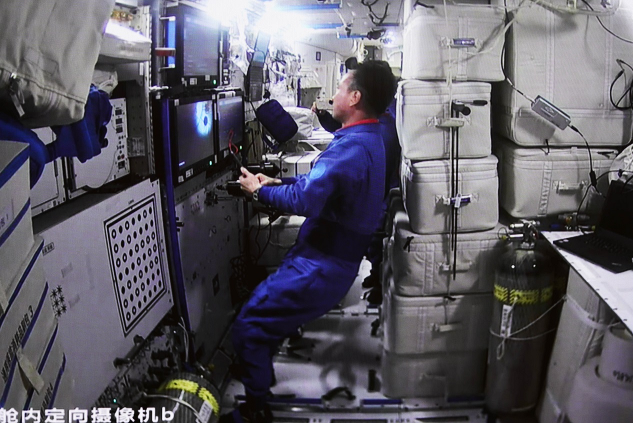 早前在北京航天飛行控制中心拍攝的天舟六號貨運飛船與空間站組合體完成交會對接後天和核心艙內的畫面。