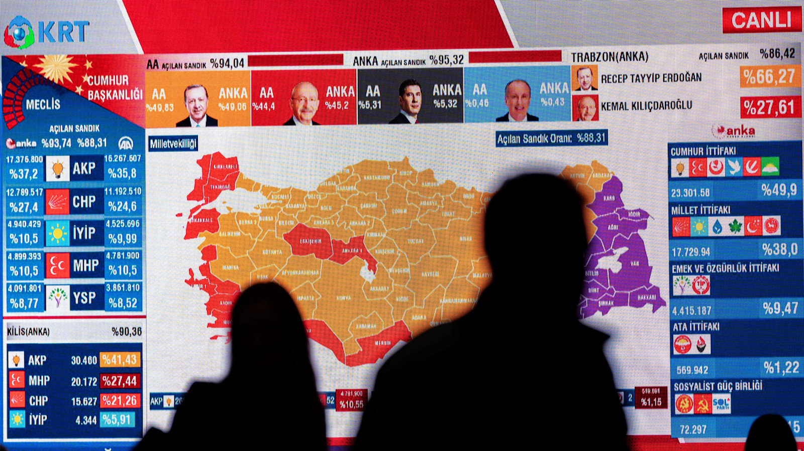 國營通訊社引述已點算九成選票後,埃爾多安得票49.86%,科勒齊達奧盧有44.38%,都達不到過半數當選門檻。69歲的埃爾多安在競選總部向支持者講話,形容選舉在積極民主的氣氛下進行,雖然結果未明朗,但自己明顯領先,如果需要舉行第二輪投票,他亦會歡迎。