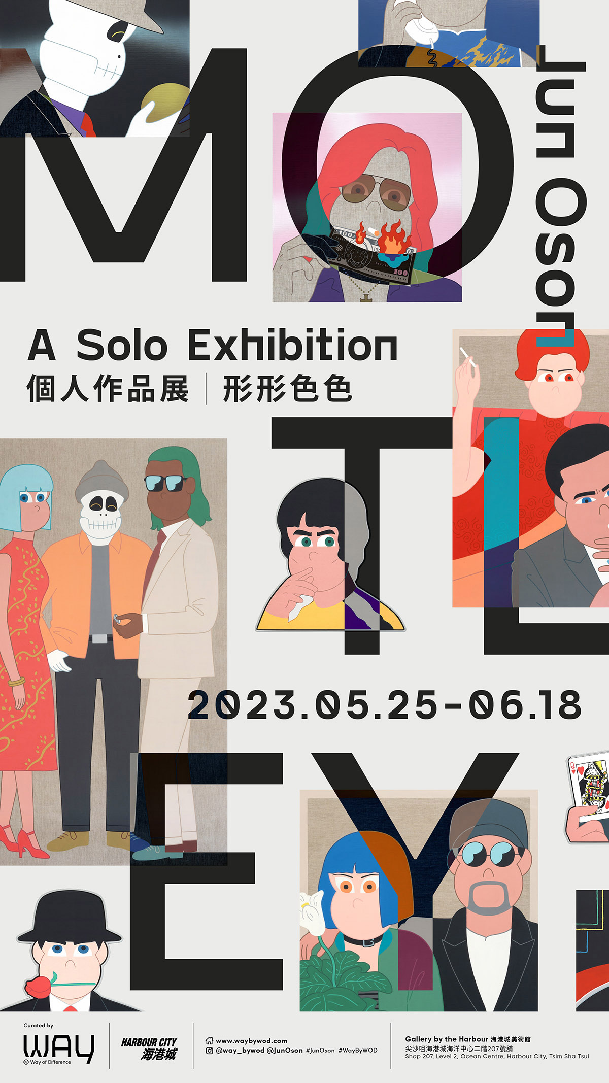 儘管從未親身到訪香港,Jun Oson卻對這城市有深刻的「不夜城」印象,全因他十分喜歡在日本的電視上觀賞經典的港產片。電影中燈火璀璨的繁華夜景和絡繹不絕的人潮,即使是意想不到的人和事都有機會發生在這國際大都會,令人看見越夜越美麗的香港。今次的個展中,他就決定將焦點放在 90 年代的港產片和夜香港上,與大家分享他心中最迷人、最有活力的城市,而《形形色色》(MOTLEY)一字就瞬間浮現在腦海中,成為今次畫展的標題。Oson說:「夜間的霓虹燈映照出都市的慾望,這浮城,從不歇息。」