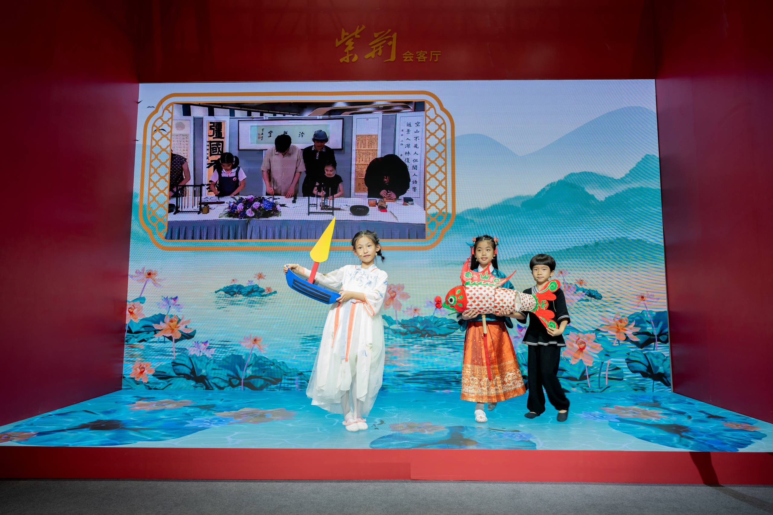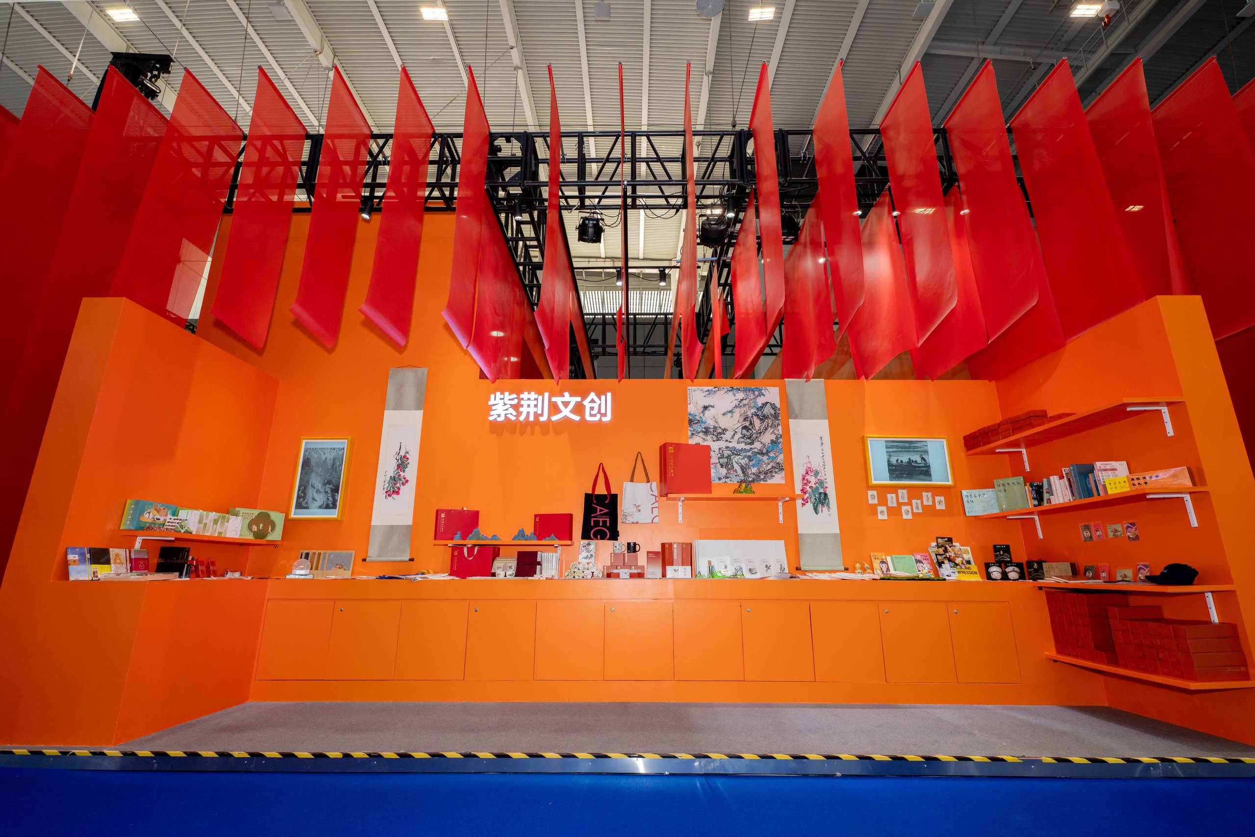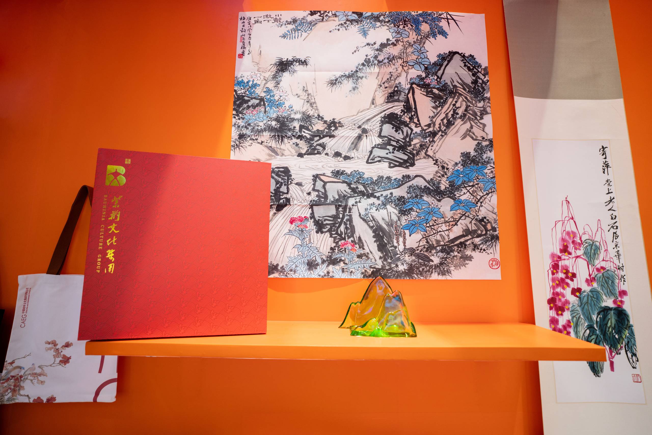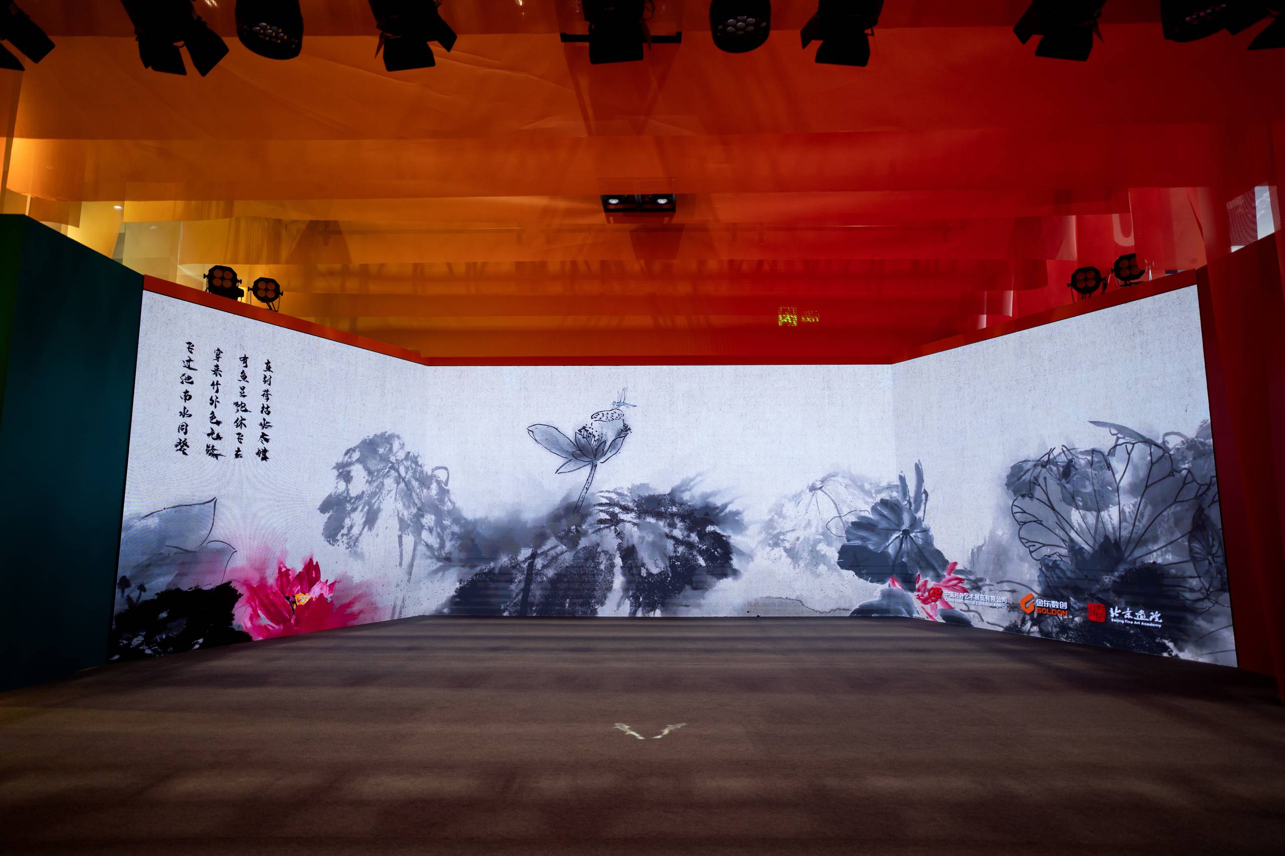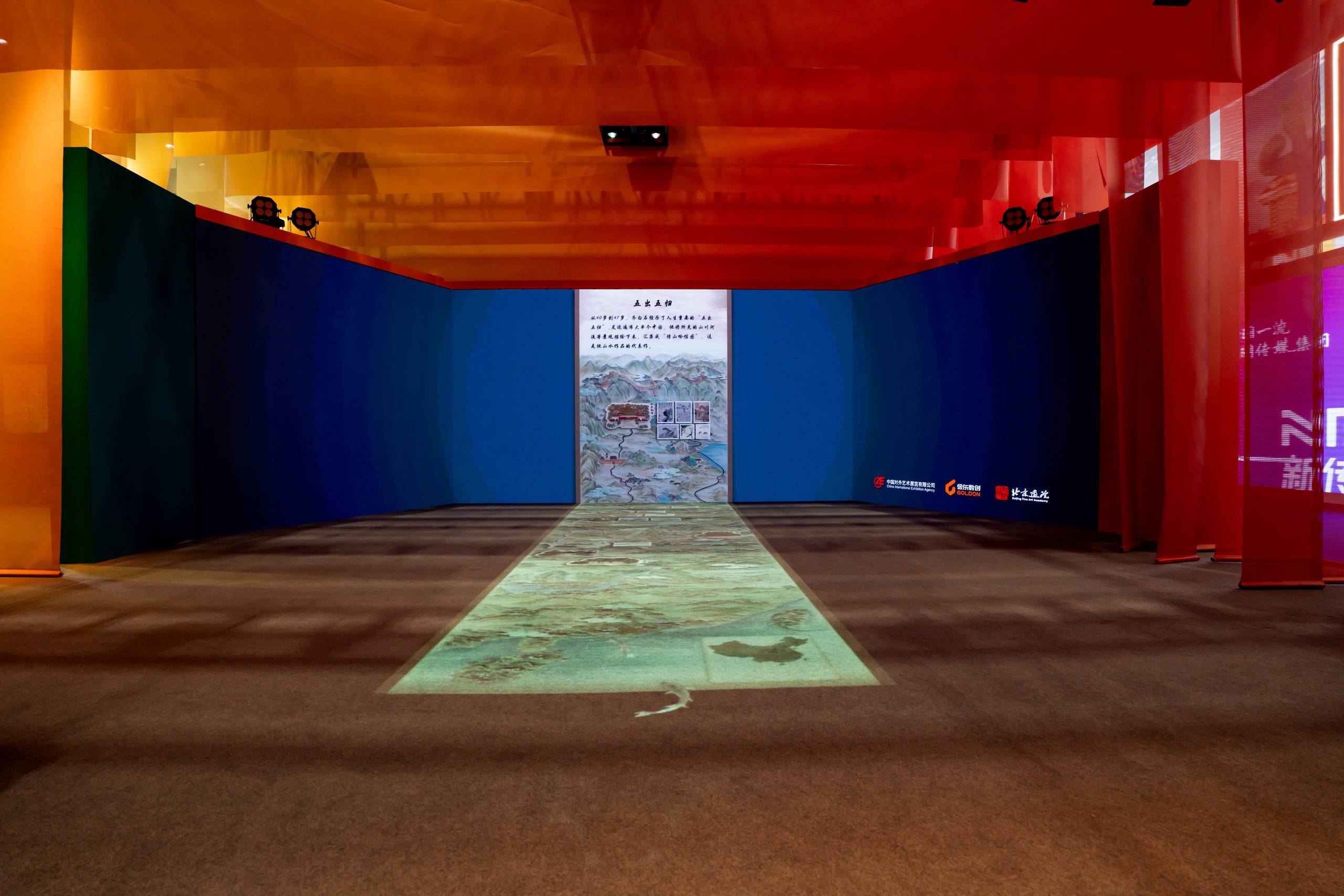 展廳色調靈感來自於《千里江山圖》的中國色,以石綠、松石、松花、蒸栗繪入紫荊紅,組成中國山水漸變的唯美帷幔,展廳結構以通道、通透的方式打破空間局限,形式與內容相通、氛圍與光影相通、科技與藝術相通、場內與場外相通,充分展示紫荊文化集團堅守中華文化立場,以文化人、以藝通心的使命擔當。