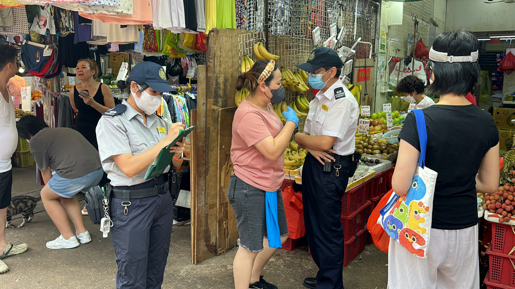 食環署人員在街市內巡查多個店舖,向違規的店上作出票控。