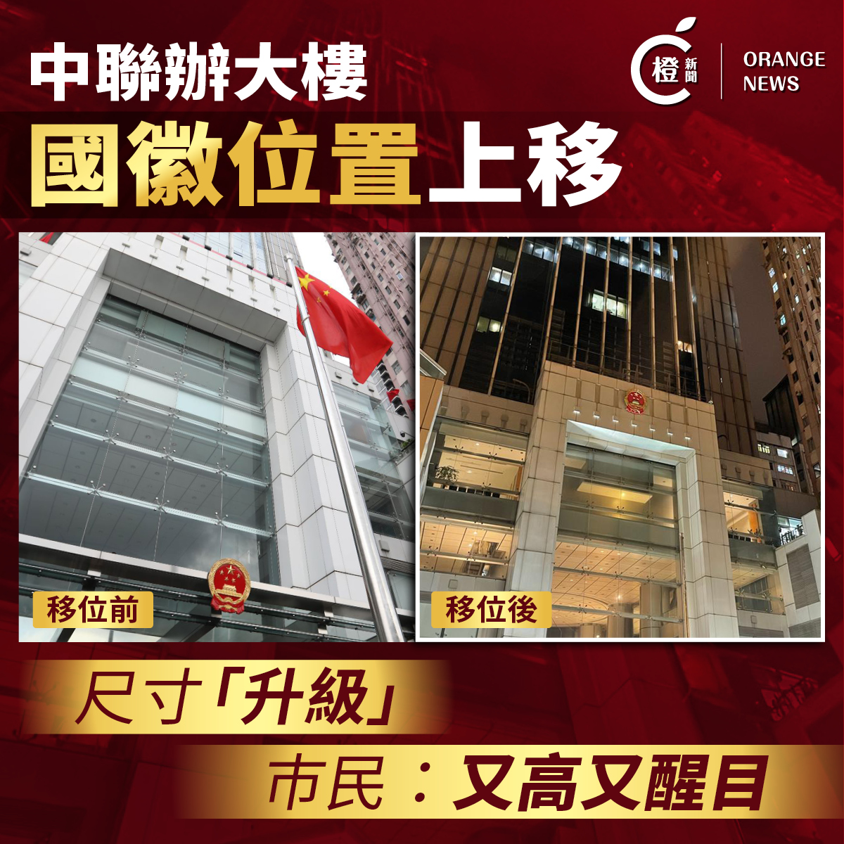 香港中聯辦大樓外國徽位置較以往上移至外墻更高處,而且尺寸有所增大。圖:橙新聞