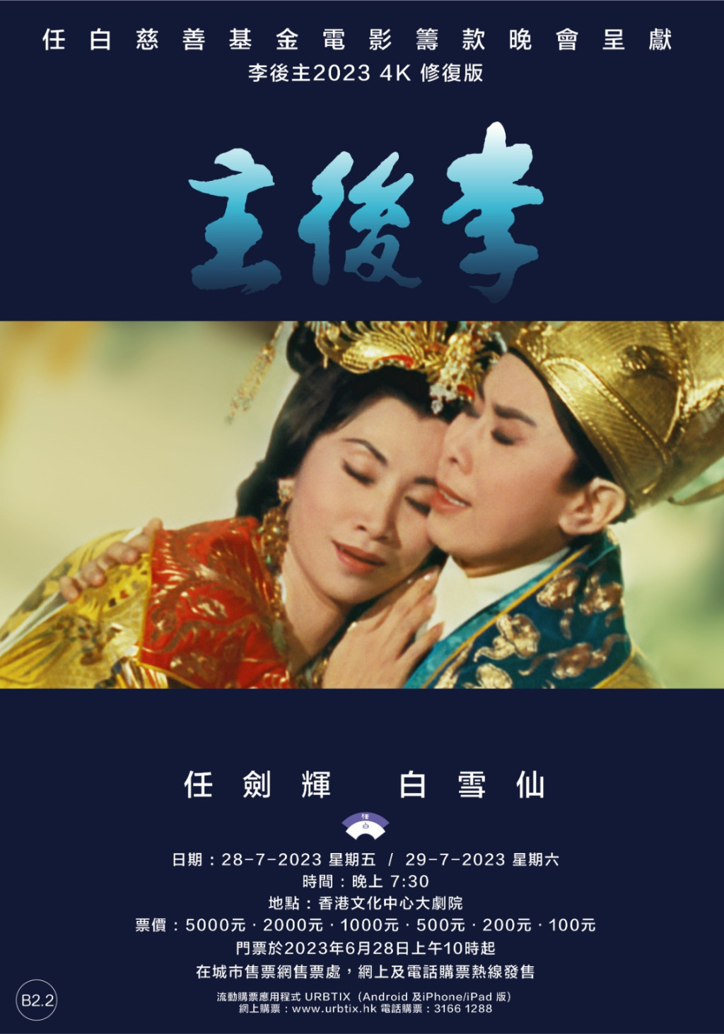 4K修復版《李後主》將於7月28及29日於香港文化中心大劇院舉行兩場慈善放映會,為任白慈善基金籌款。放映會門票正在城市售票網發售中,想要觀看這部罕見的任白佳作的觀眾要把握機會啦。