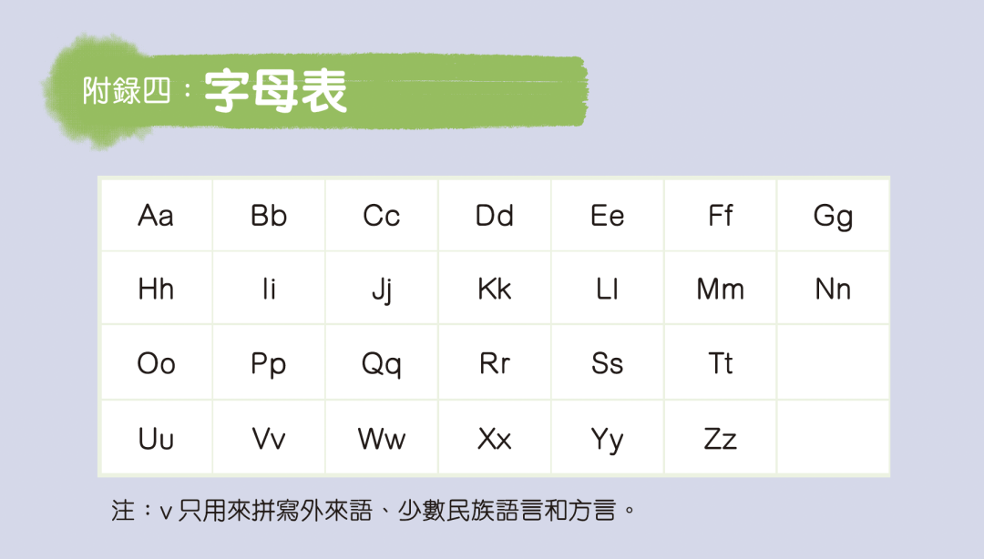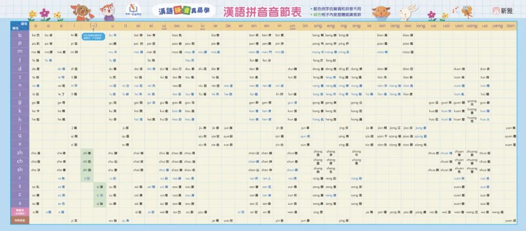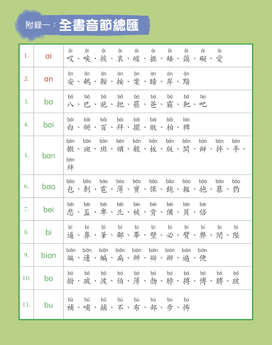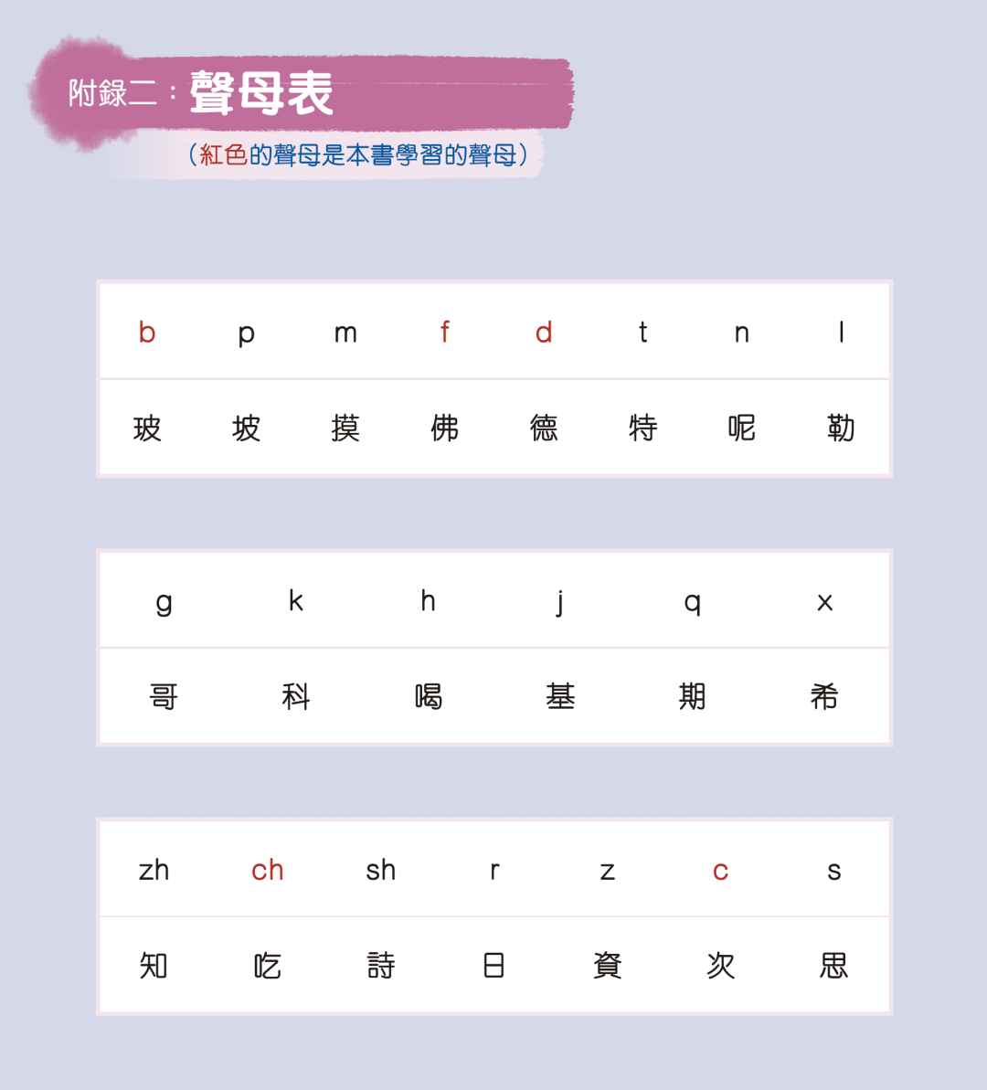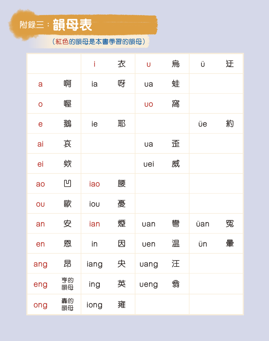 3. 書後附有「聲母表」、「韻母表」和「字母表」,並列出書中所學習的所有音節,方便複習。
