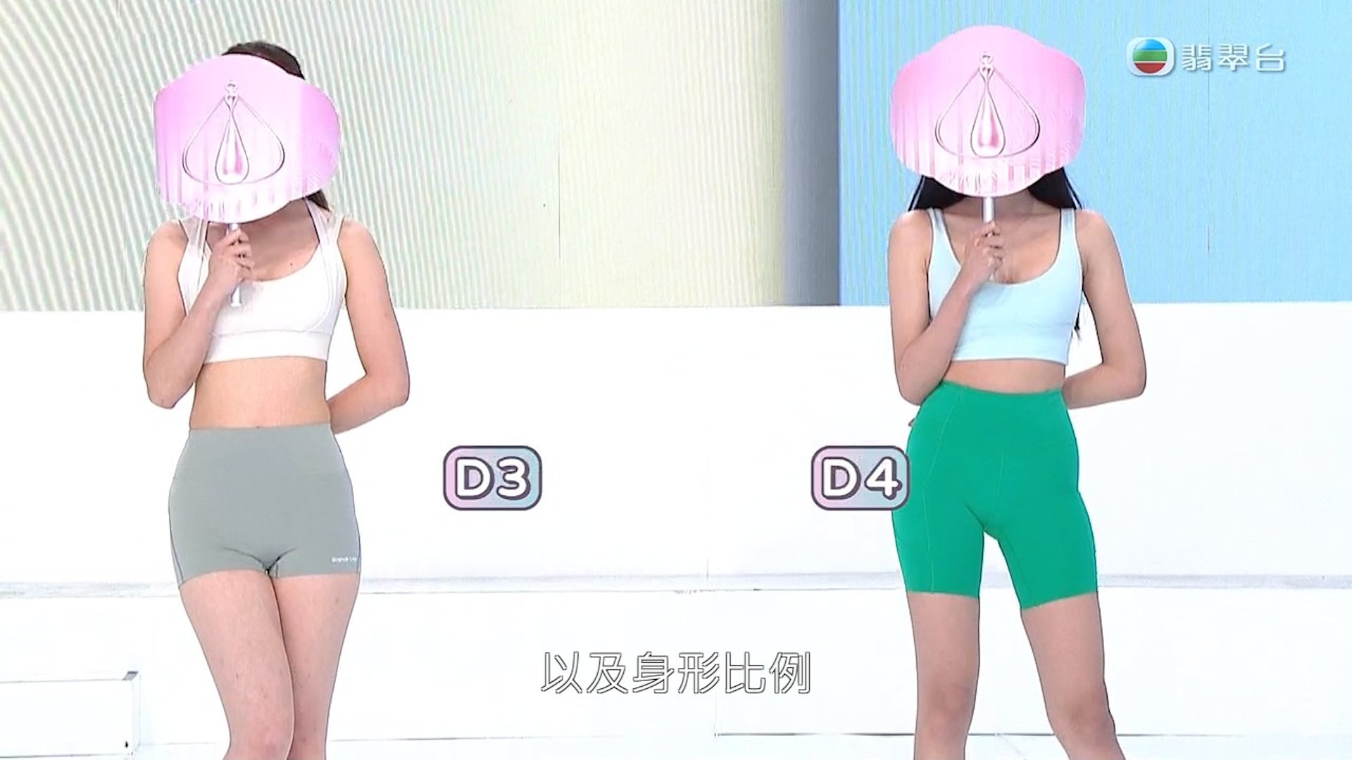 在燈光和瑜伽服裝的互相影響下,有部份佳麗現「駱駝趾」(圖:《2023香港小姐競選》節目截圖)