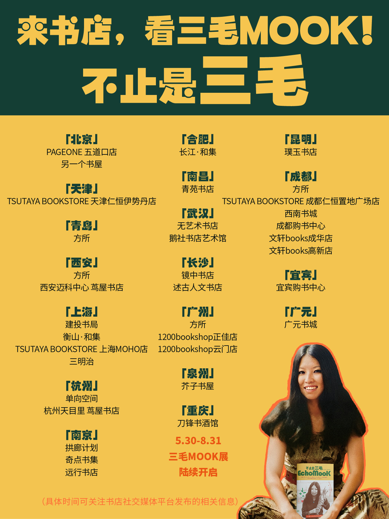 極具人文情懷,在2019年的倫敦書展中獲得「年度最佳書店」獎的廣州方所書店即日起至8月31日將展出這本三毛MOOK,同時特別設置三毛主題空間:一面主題海報牆、一本獨一無二的MOOK、特別定制的「三毛提醒」購物袋以及數副三毛手稿,亦會在現場發售三毛著作。主題空間展出期間,讀者若購買新經典文化出版的三毛作品一本,即可獲贈一款指定購物袋。