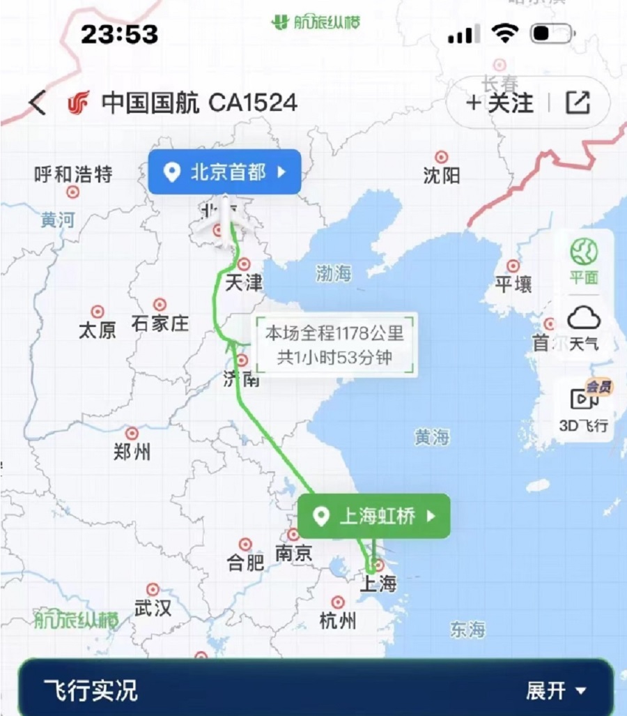 國航CA1524航班於下午5時17分降落於北京首都機場。