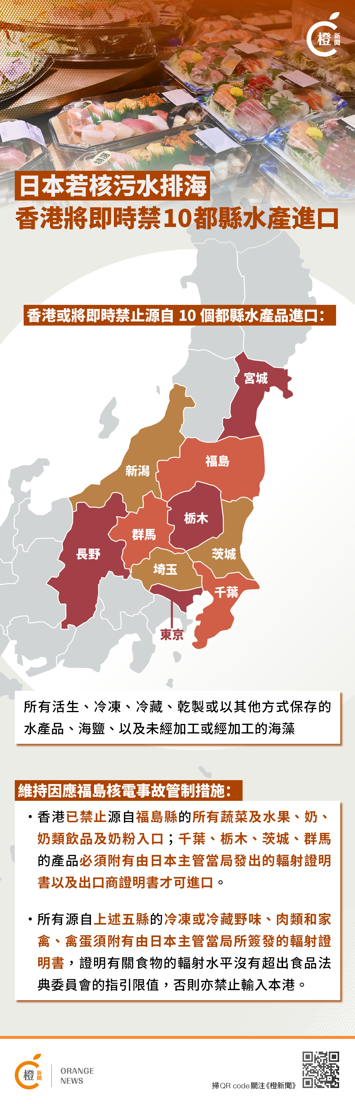 【橙訊】特區政府昨日(12日)公布,基於預先防範原則,目前計劃一旦日本開始排放福島核廢水,會即時禁止源自東京、福島、千葉、栃木、茨城等十個都或縣的水產品進口,以確保香港的食物安全和公眾健康。《橙新聞》整理並製作圖表,讓讀者更直觀了解相關細節。