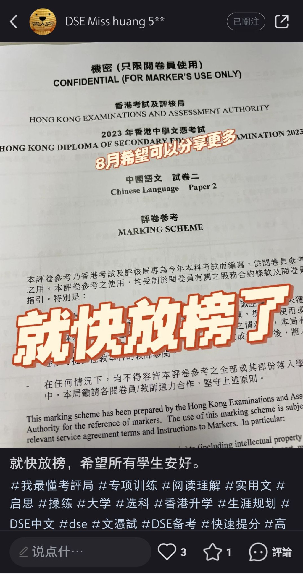 日前小紅書上一個名為「DSE Miss huang 5**」的帳戶聲稱自己是任教10年經驗的教師,亦是應屆文憑試中文科的閱卷員,近日更載圖片,展示應屆文憑試中文科卷二,即作文卷的評卷參考封面,圖中可見「機密(只限閱卷員使用)」字樣。該帳戶還在圖中加入「就快放榜了」、「8月希望可以分享更多」標語,更標籤「#我最懂考評局」;另一則帖文預告下月與考評局約滿,將進一步公開評卷參考的內容。